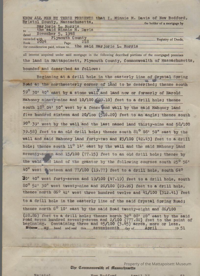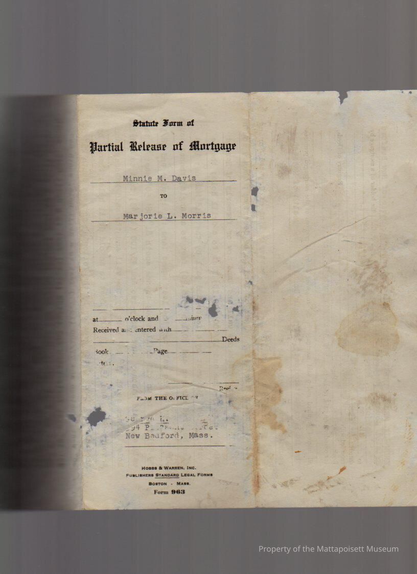 Minnie M. Davis of New Bedford, mortgage holder to Marjorie L. Morris, 3.45 acres of land.Collection
