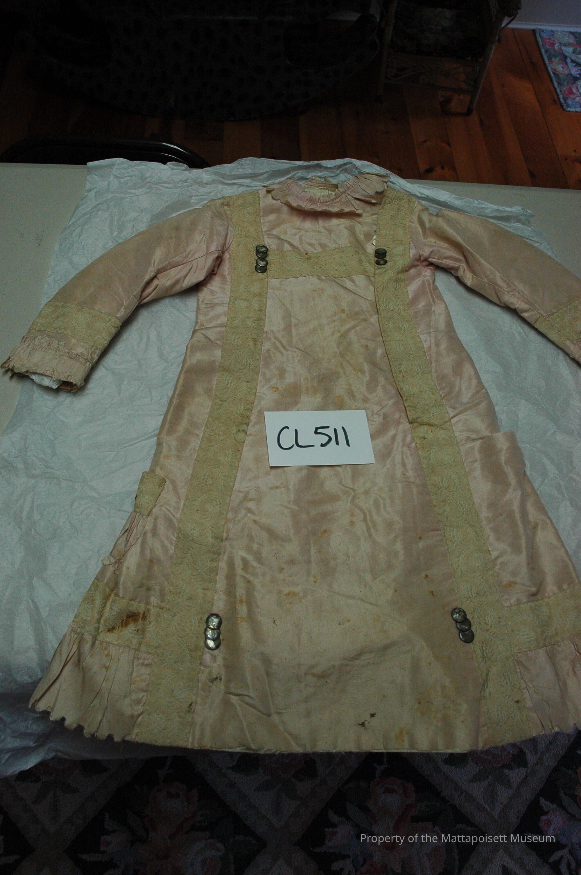 Notes: Notecard: Child silk tafetta dress, pink with heavy panel trim. Damask design. Mother of pearl disk trim.Created By