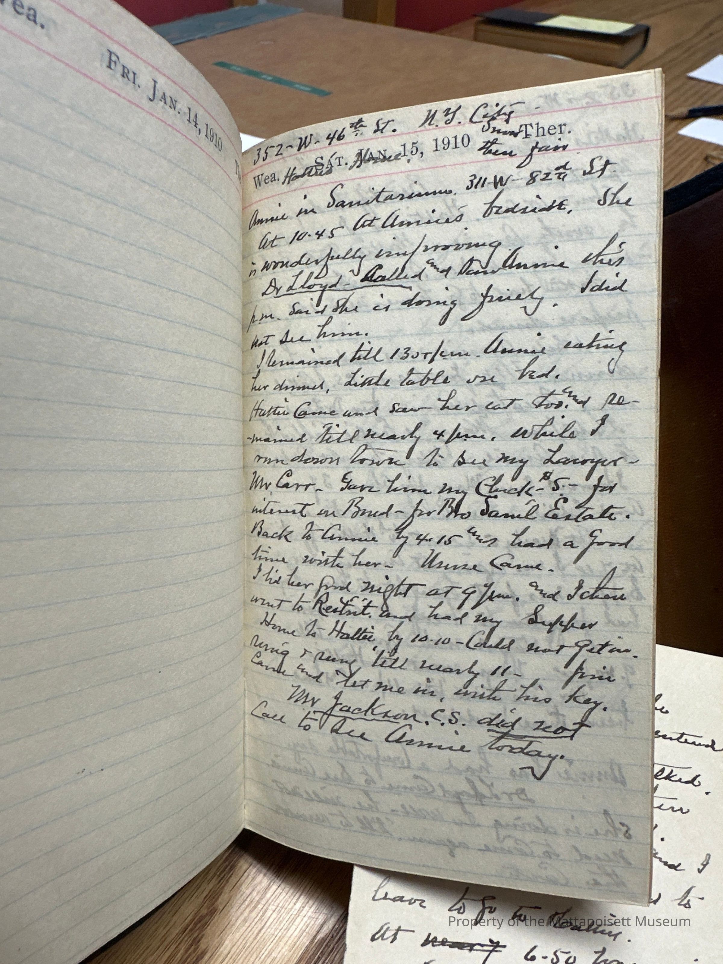 Diary of daily events, accounts, and addresses taking place in 352 W-46th St., N.Y. City and Mattapoisett. Inserted in the diary is a newspaper article from October 3, 1910 describing a meeting of the Women's Christian Temperance Union, WCTU, at the home of Mrs. B. F. Shaw. Mr. and Mrs. Henry Barrows and their daughter, Mrs. Dunseith (Hattie Barrows), were guests, and Mr. Barrows assured the ladies that he was a total abstainer.