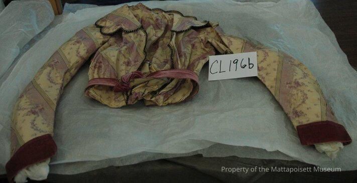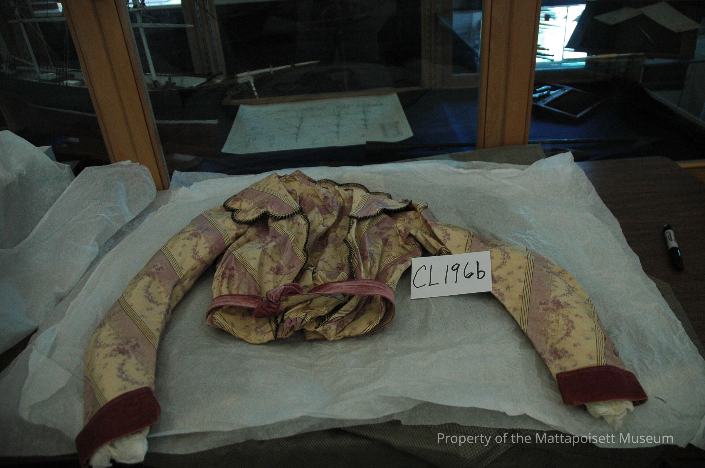 Notes: Notecard: Moire Taffeta purple velvet trim waits and scalloped edging. Wedding dress of Florence Gray Tenney Howe, August 5, 1899. Also used by her daughter, Florence Ella Howe Bennett, January 20, 1934.Created By
