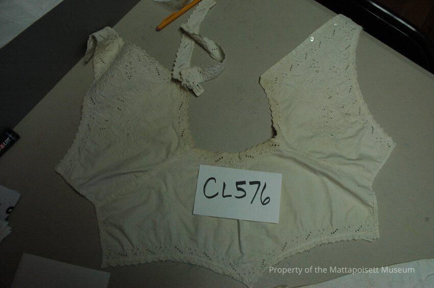 Notes: Notecard: White cotton capelet with heavy embroidery. Name: Mary F. Wood.