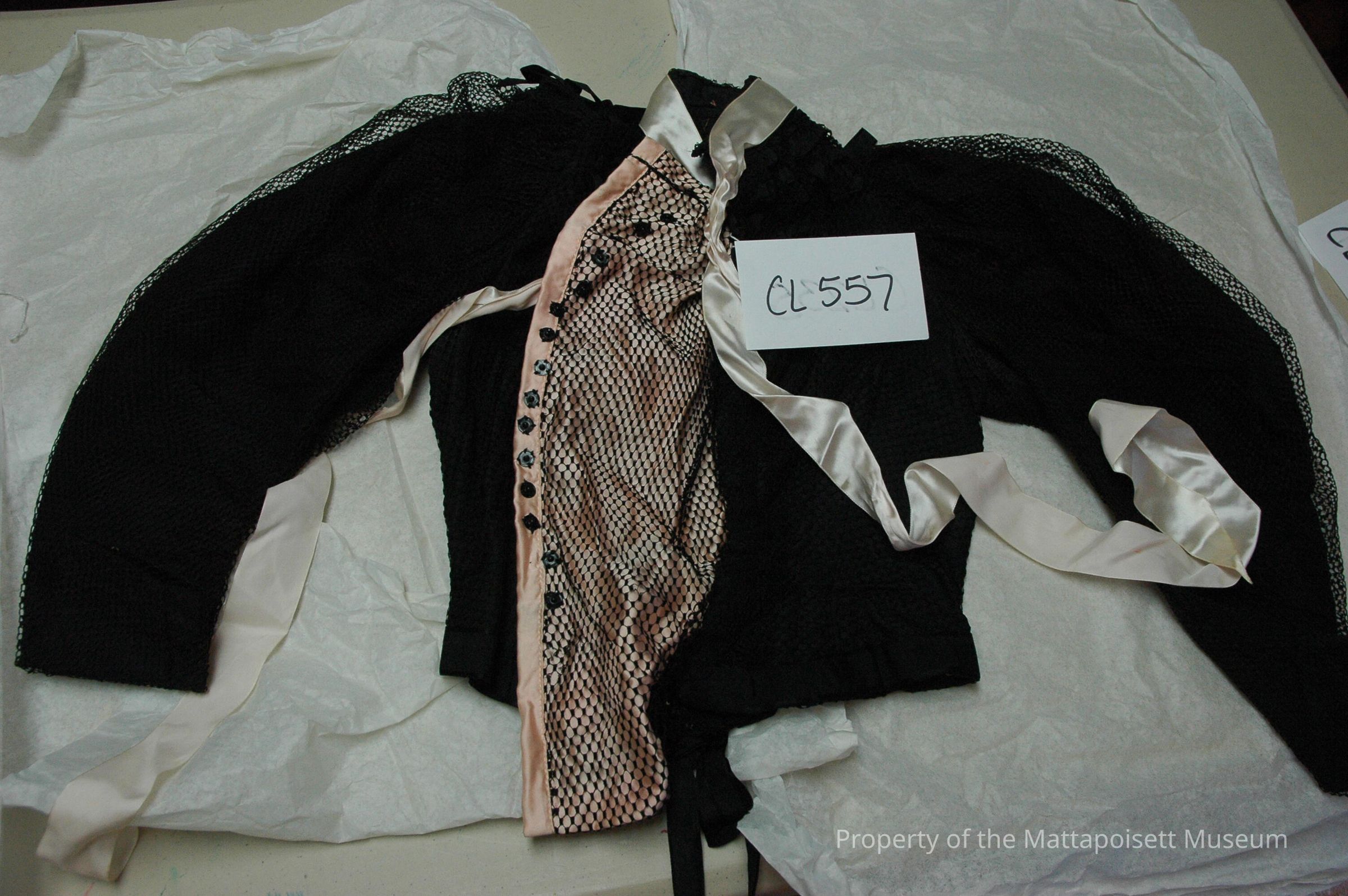 Notes: Notecard/Old description: Black brocade waist, netting over detail. Mandarin collar, pink satin ribbon at neck. Black and white lace cuffs.