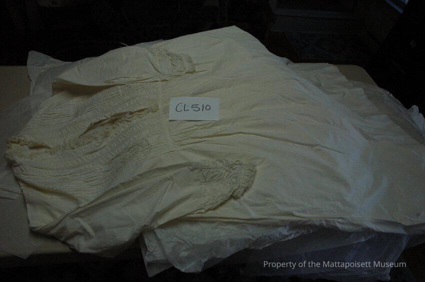 Notes: Notecard: White cotton nightgown, pleated, shirred bodice and cuffs.