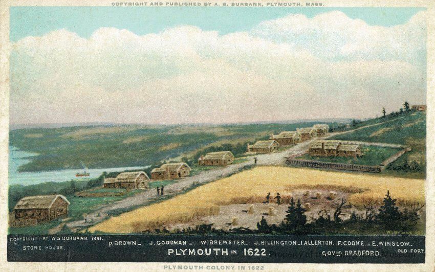 Hand-colored postcard showing Plymouth in 1622.Collection
