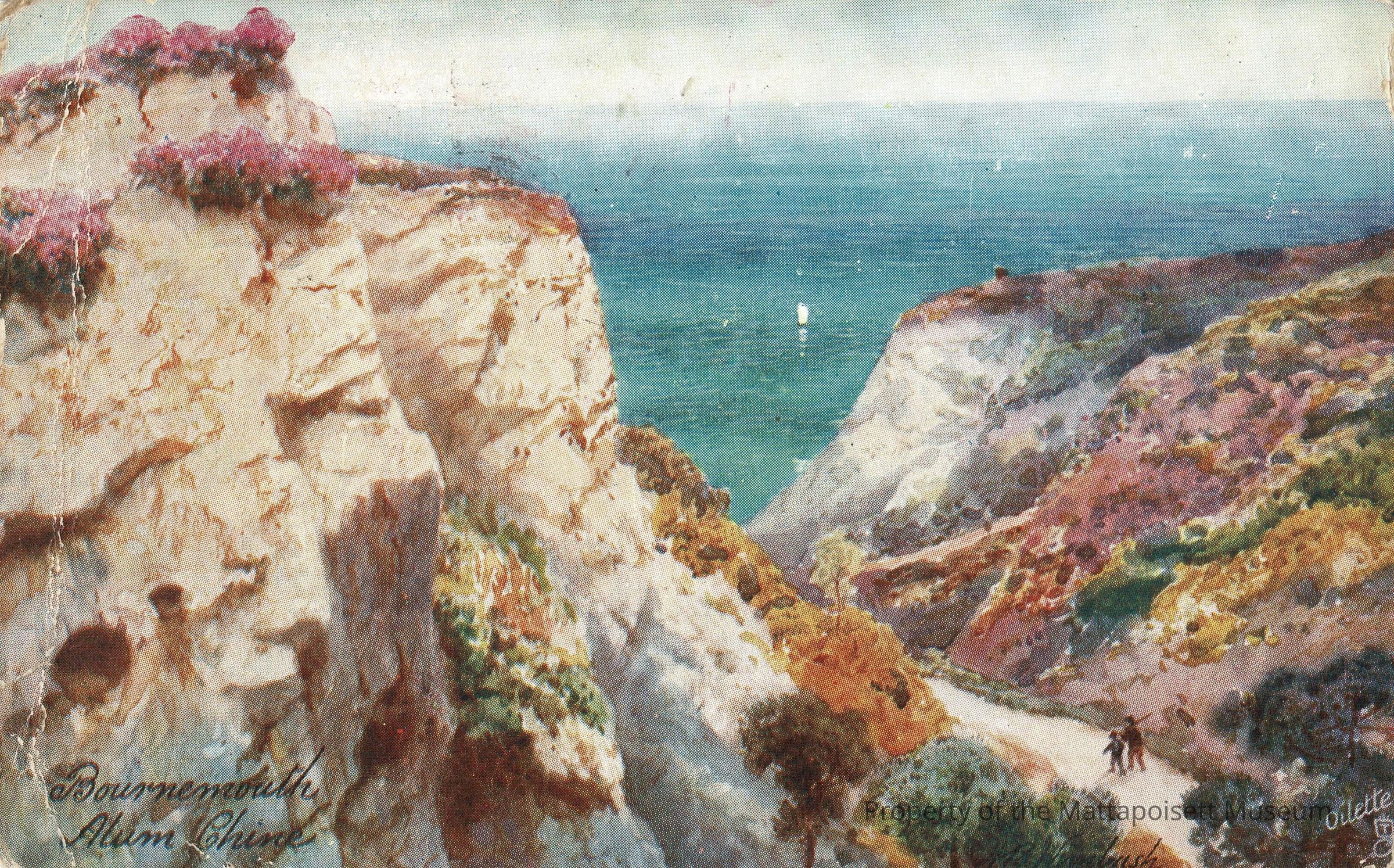 Hand-colored postcard showing Alum Chine, Bournemouth, England. Handwritten note sent to Mr. Charles Mendall, Care of Mr. George Purrington, Jr., Mattapoisett, Mass. U.S.A. Postmarked January 4 (date not legible) from West Kensignton.Collection