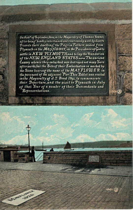 Colored postcard showing the plaque Mayflower 1620. Handwritten note stating, "I am writing this, standing on the Mayflowers stone."Collection