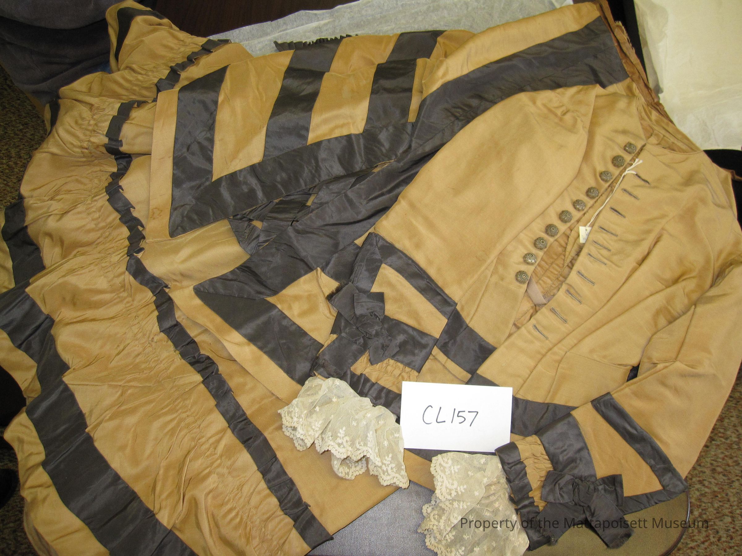 Notes: Notecard: Brown and gold silk faille gown, crocheted covered buttons. Lace cuffs, calamanco lining. Brown pleated neck ruffle, not attached bustle.