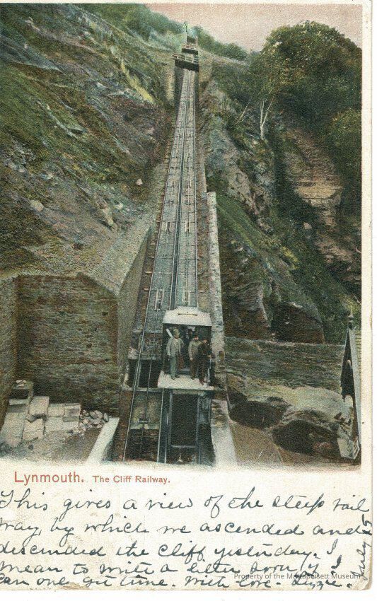 Hand-colored postcard showing Lynmouth, The Cliff Railway, North Devon, England. Handwritten note to Mrs. George Purrington, Mattapoisett, Massachusetts, U.S.A. Postmarked received in Mattapoisett, Mass on July 23, 1904.Collection