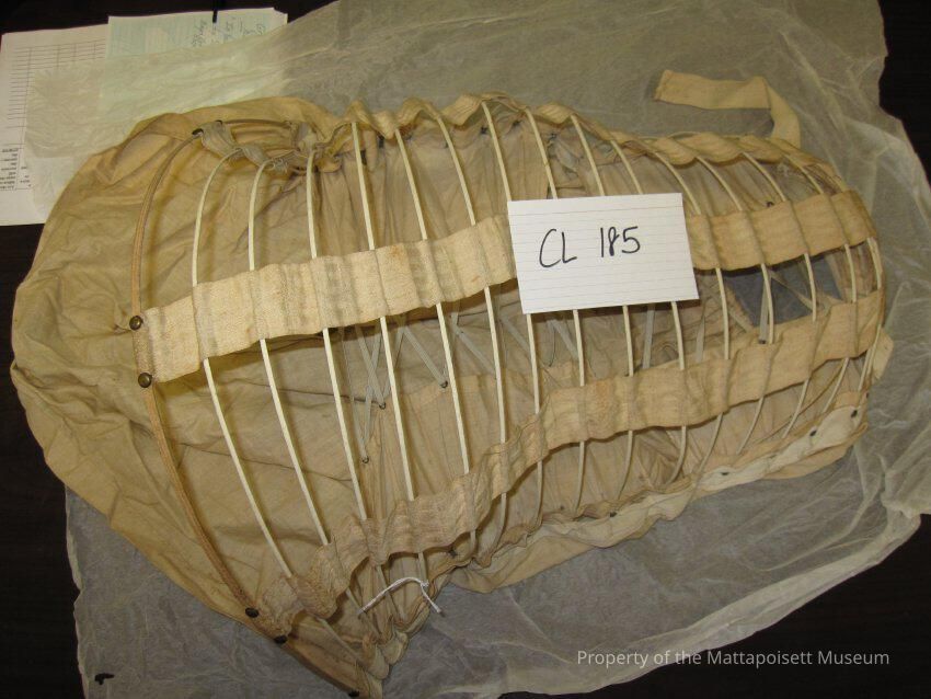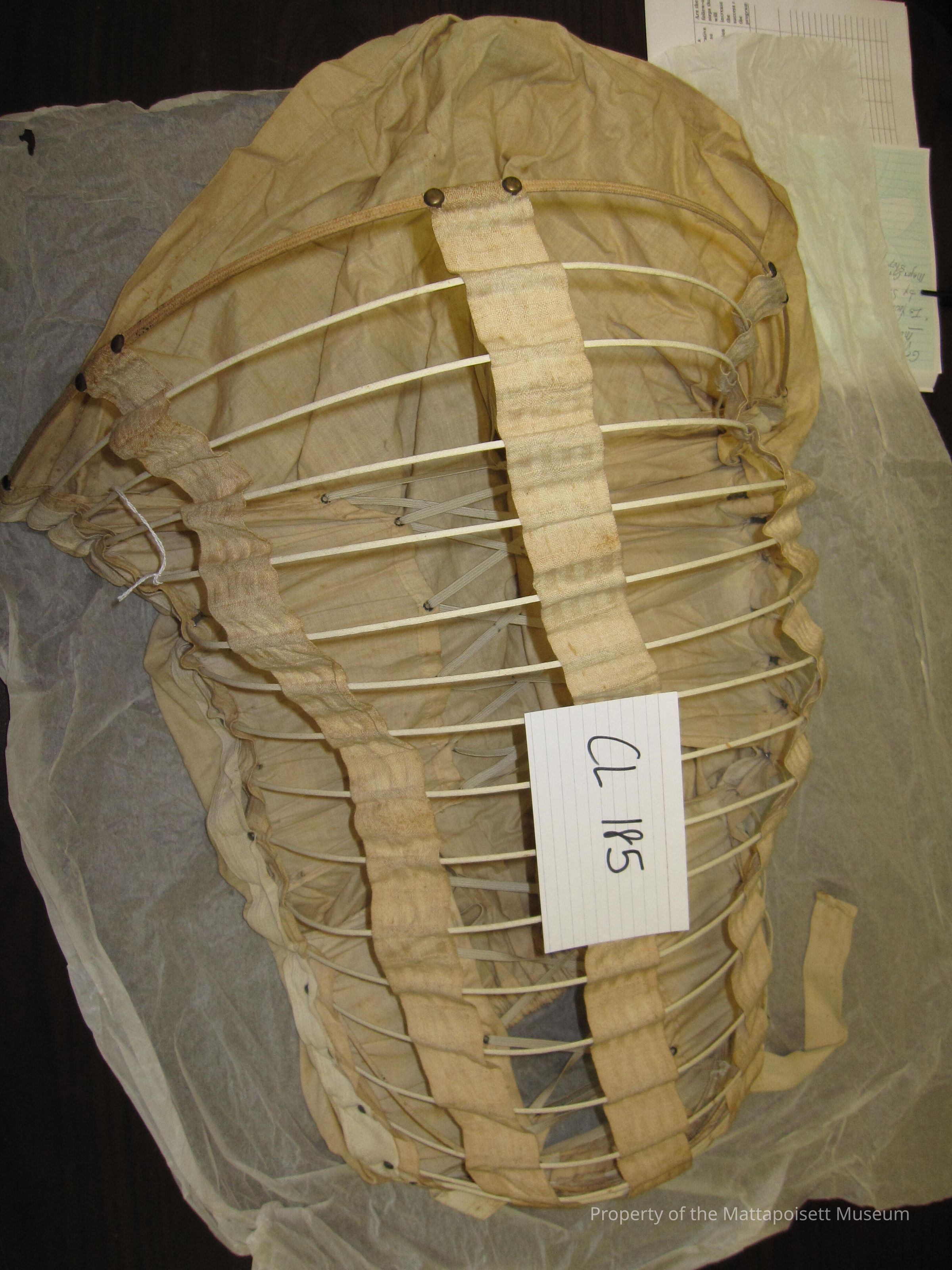 Bustle or half hoop. Ivory colored, muslin covering wire. Inside tag: Virginia Faber, Mattapoisett, Mass.Collection