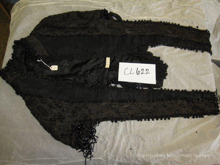 Black taffeta shoulder cape, heavy jet trim. Long front panels. Trim missing, jet beads missing.Collection