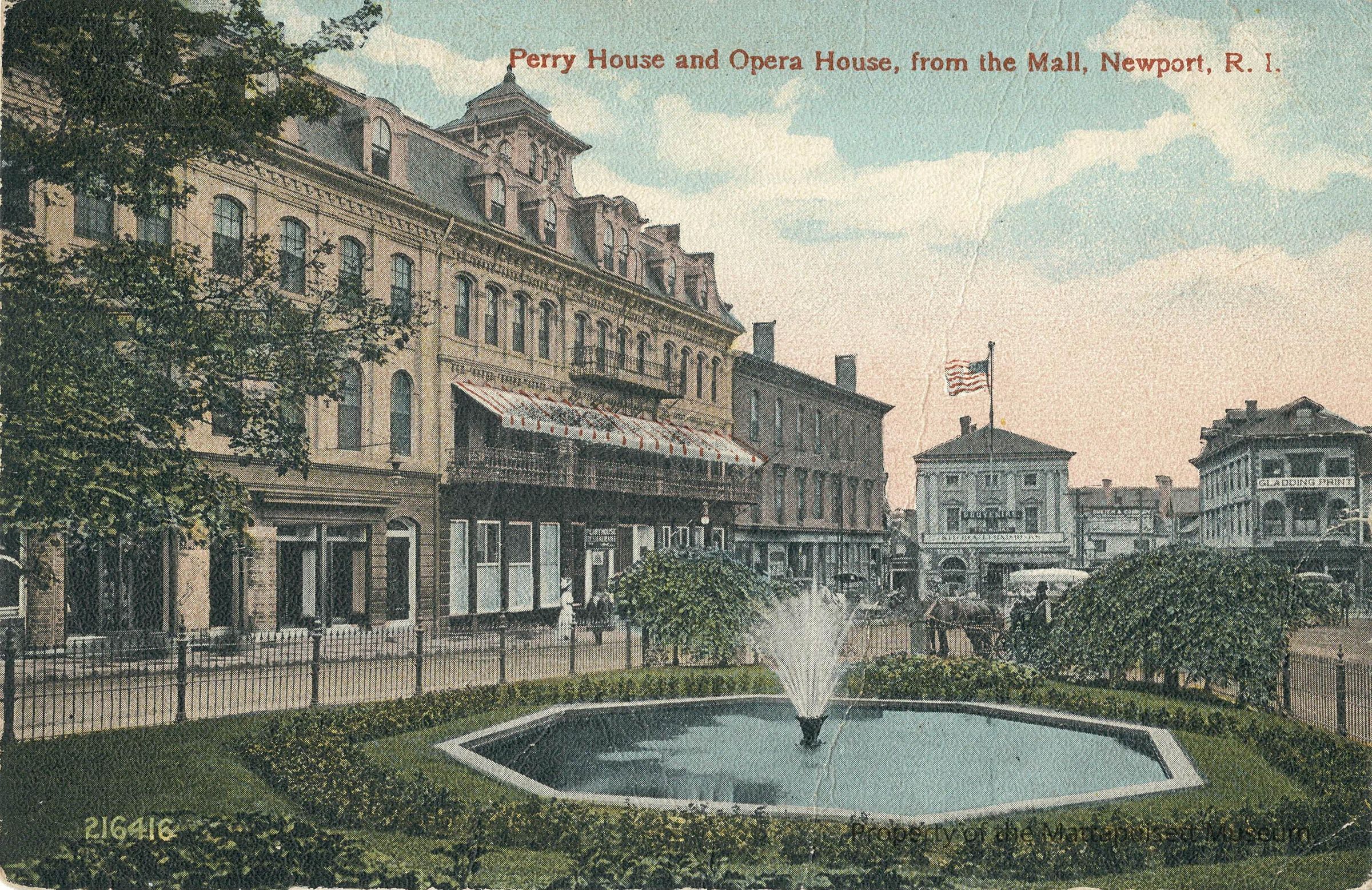 Hand-colored postcard showing Perry House and Opera House, from the Mall, Newport, R.I.Collection
