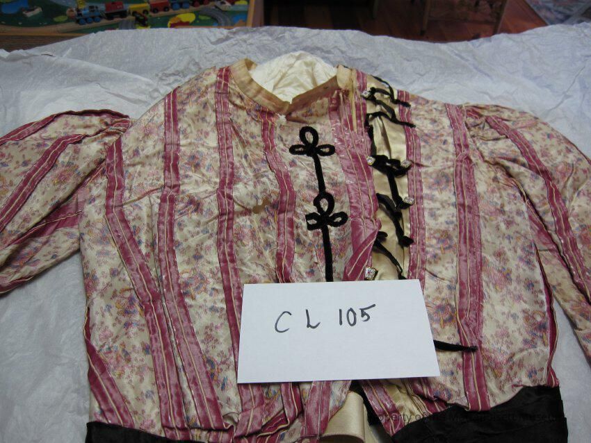 Made in Paris label. Dress top, printed silk taffeta with pink satin panels, velvet trim, buttons are china rose squares (many are missing).Collection