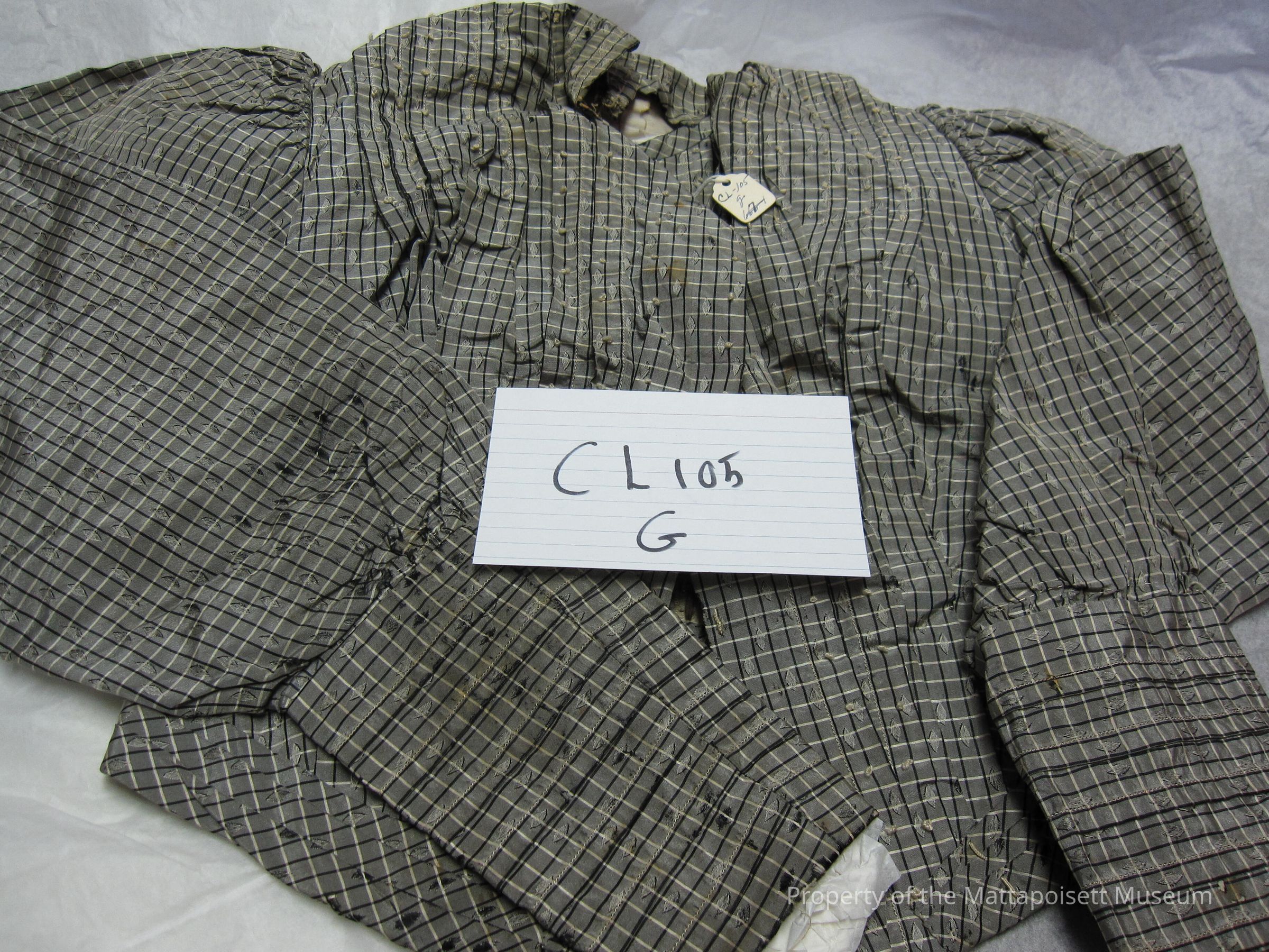 Notes: Notecard: Gray taffeta waist with black and white lined pattern. Pleated front. Lined. Leg of mutton sleeves.