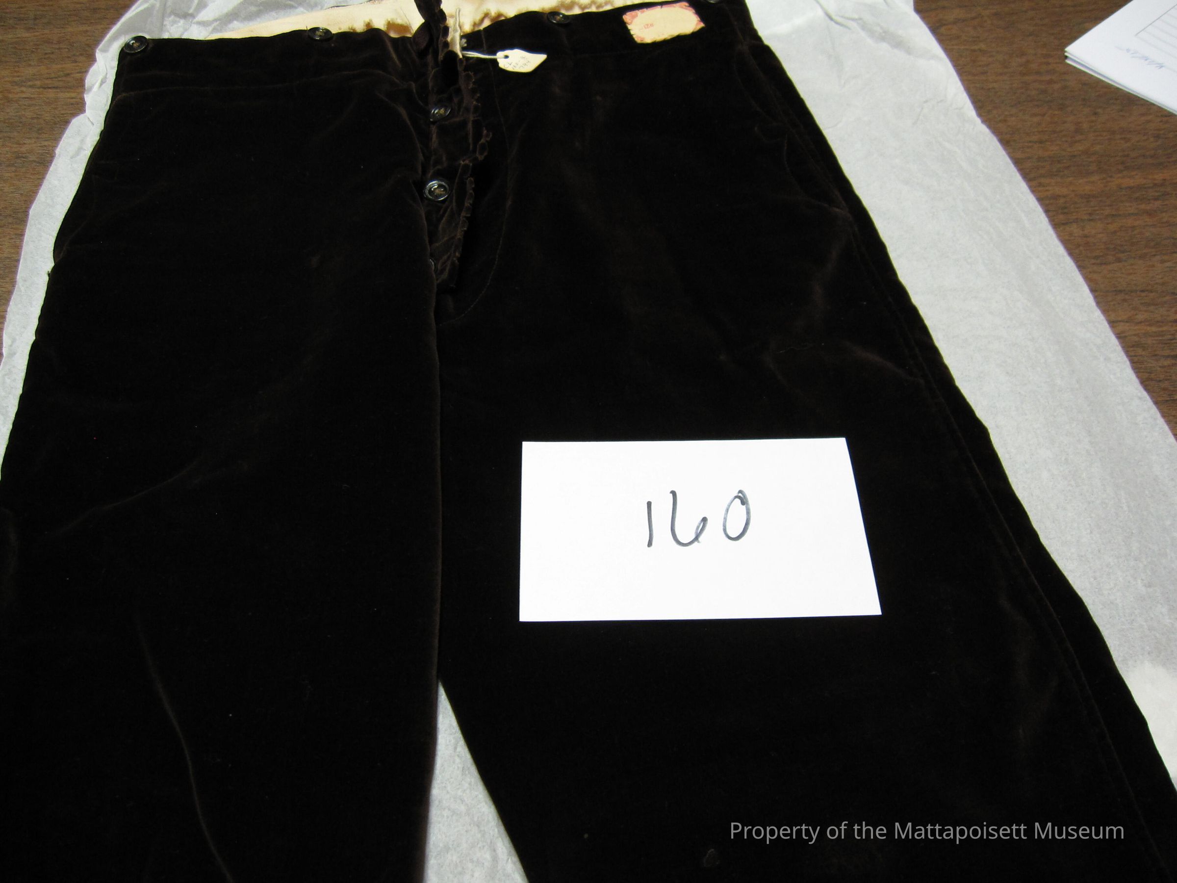 Notes: Notecard: Brown velvet knee-britches. Made for donor's father, James Hammond when he was a boy. Status: OK