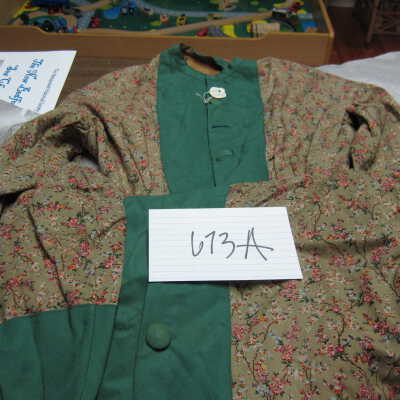 Notes: Notecard: Tan patterned dress with red flowers. Buttons down front. Trimmed in bright green down front and along botttom with green cord trim at waist in back. Calamanco lining.