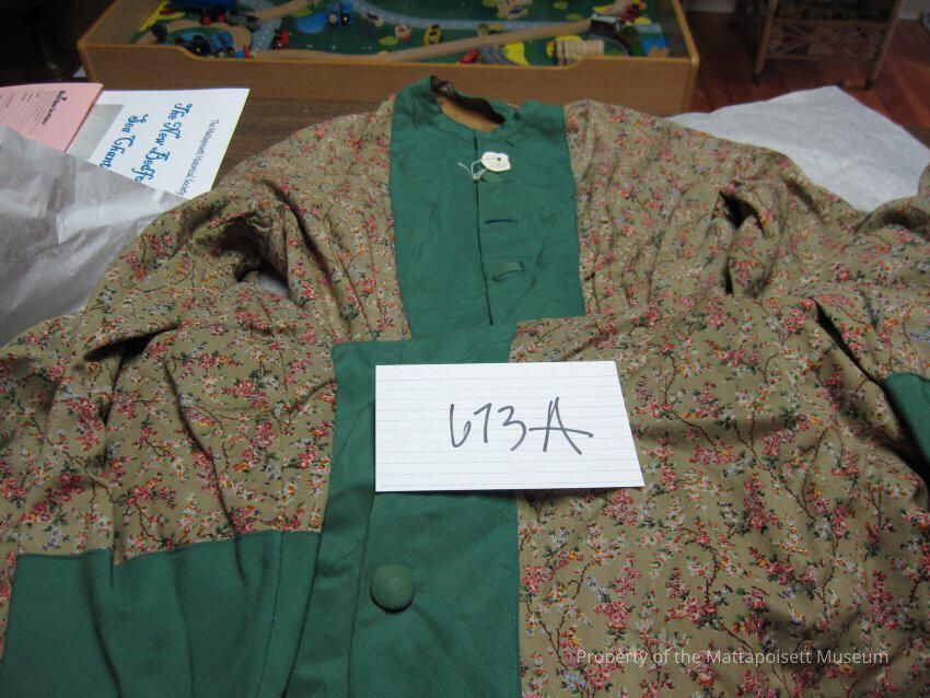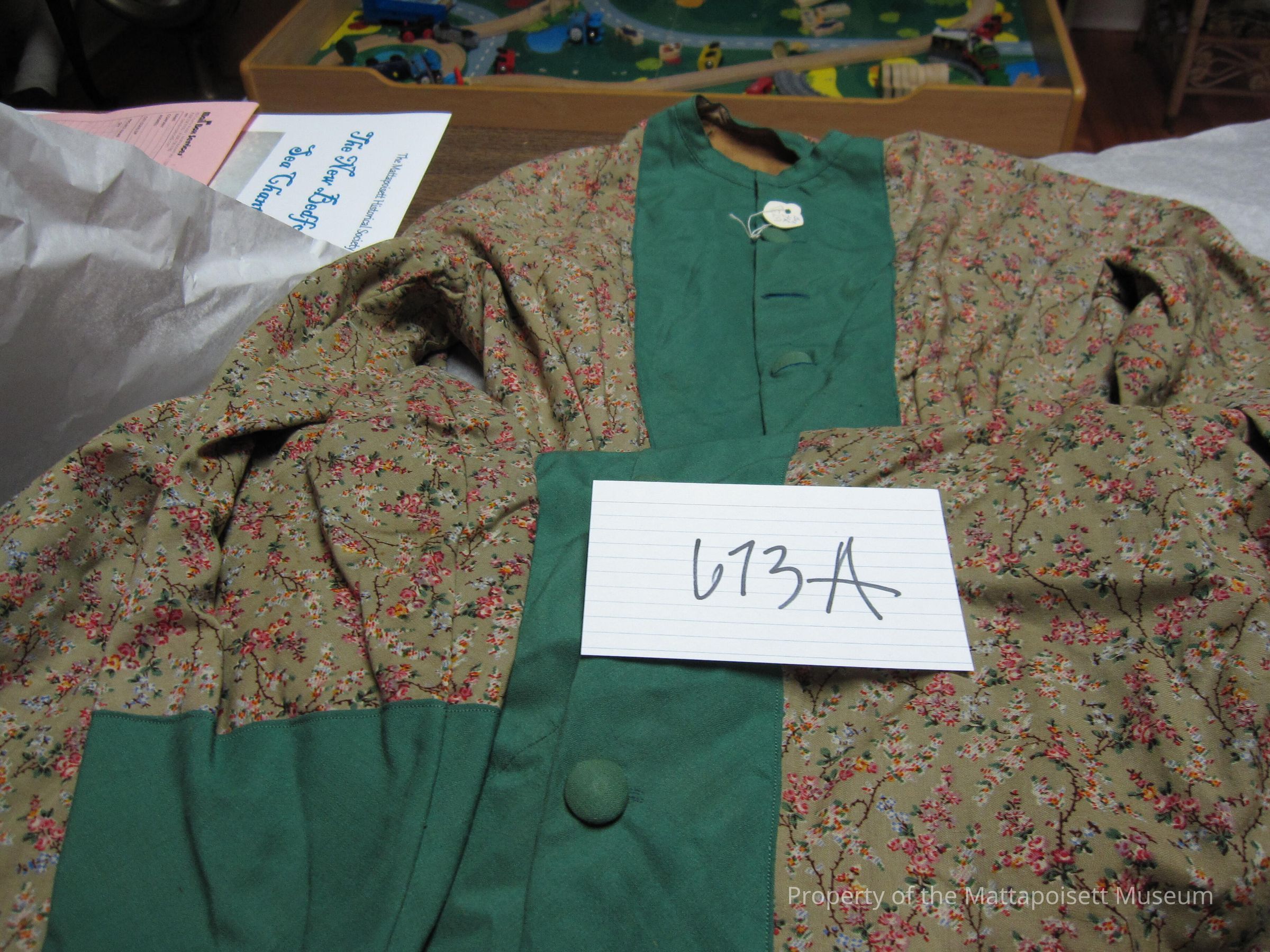 Light green house dress patterened with small red flowers. buttons down front covered in green cloth. Trimmed in bright green down front and along bottom. Cord trim at waist in back. Circa 1900.Collection