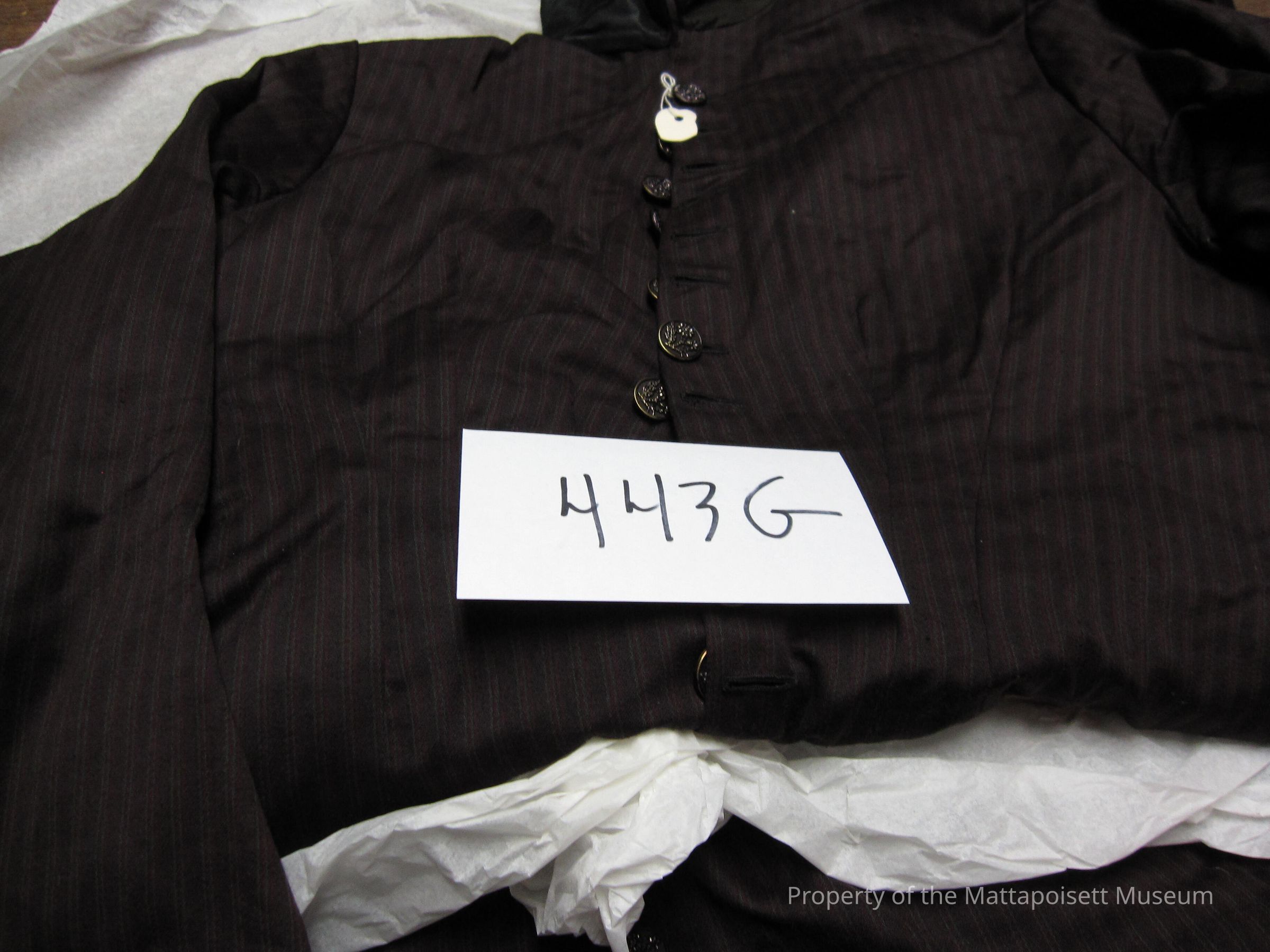 Notes: Notecard: Wine-colored striped dress. Front buttons, metal with floral design. Calamanco lining. Long sleeves. Three buttons on sleeves. Buttons up to neck. Bow of same material at back and waist.
