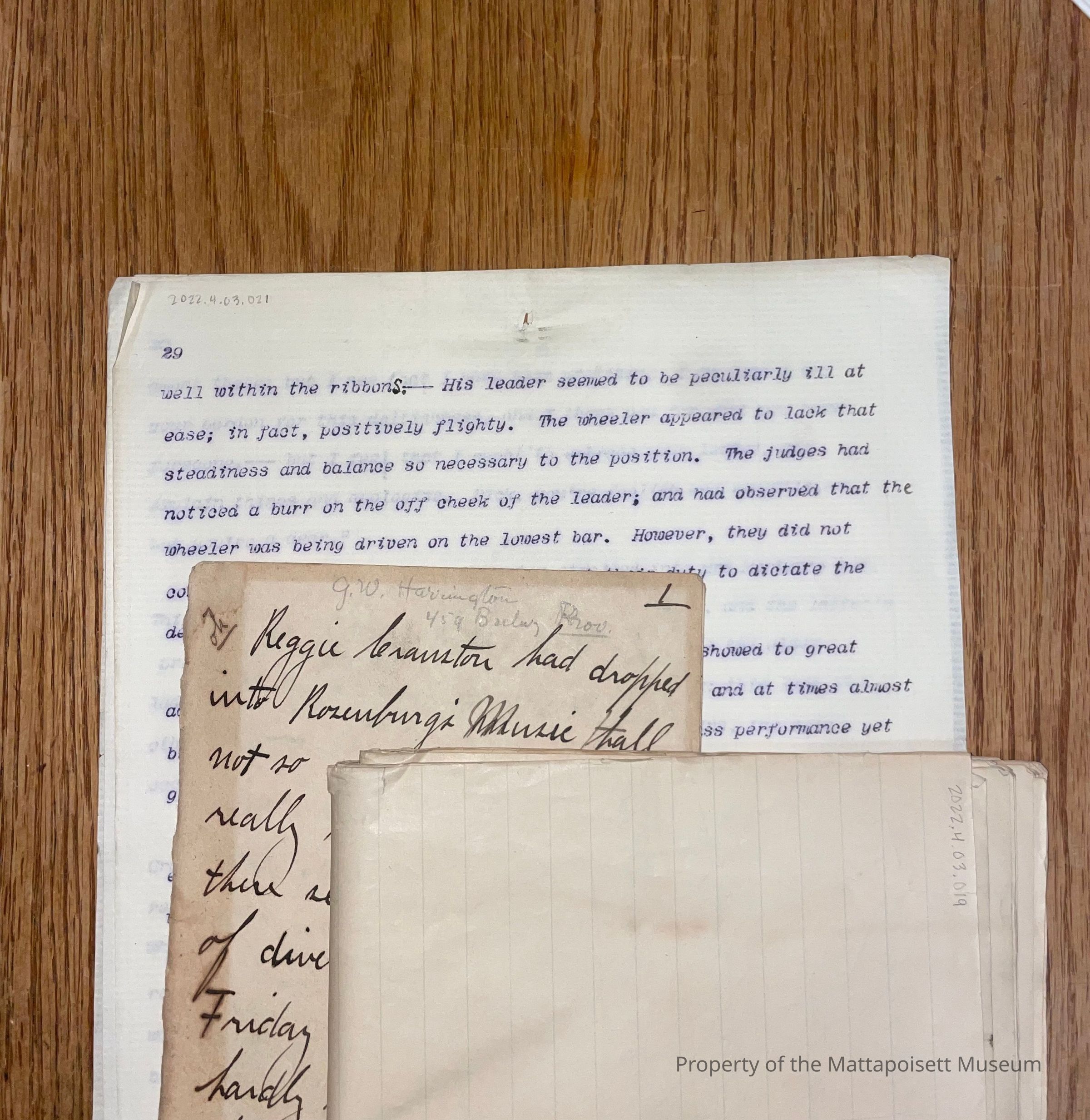 Everything in the collection (letters, manuscripts, typewriter, wedding dress, documents, books) was found in the attic of 18 Pine Island Road, Mattapoisett in 2022 and donated by the new house owners. This house was owned by Harrington and his wife. They subdivided the land and created Winnatuxett Beach Rd. George and Marian Harrington were the first couple ever married in St. Philips Church on Water Street. They were married in 1898.