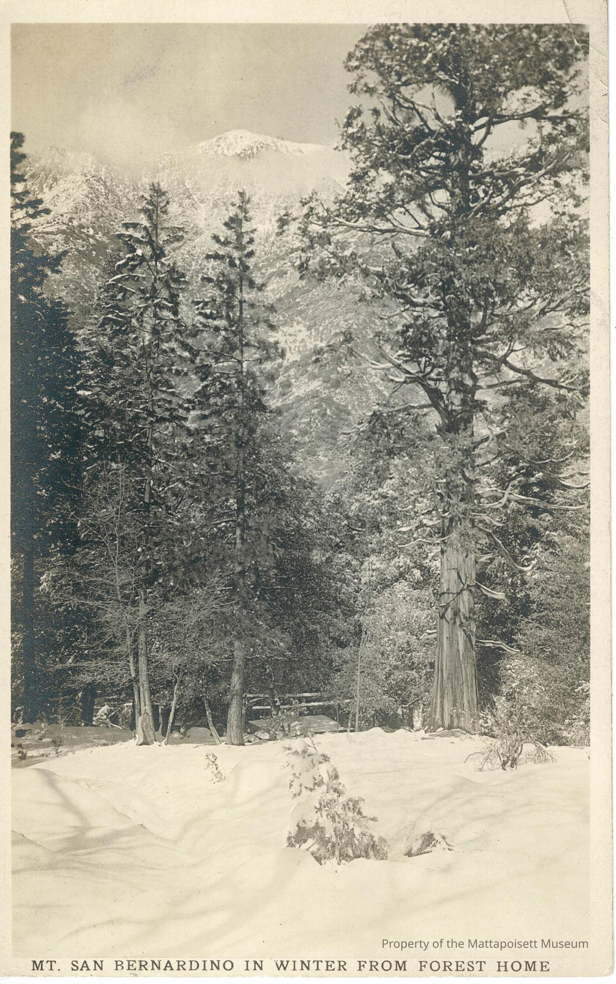 Black and white postcard showing Mt. San Bernardino in Winter From Forest Home.Collection
