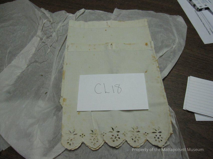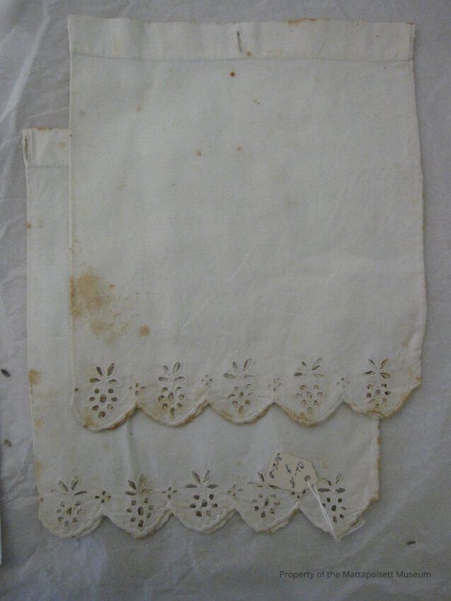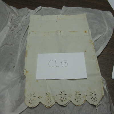 One pair of embroidered pantalettes. Cut-work, eyelet trim.