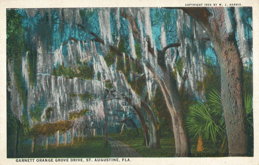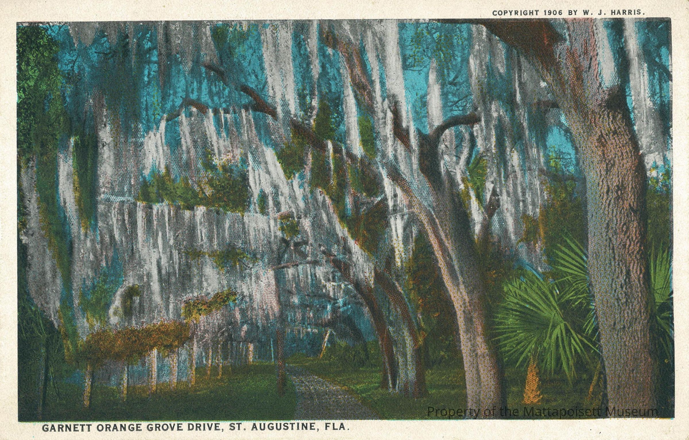 Hand-colored postcard showing Garnett Orange Grove Drive, St. Augustine, Florida.Collection