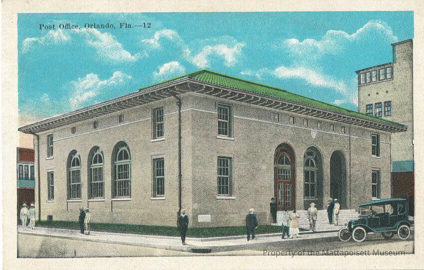 Hand-colored postcard showing Post Office, Orlando Florida.Collection