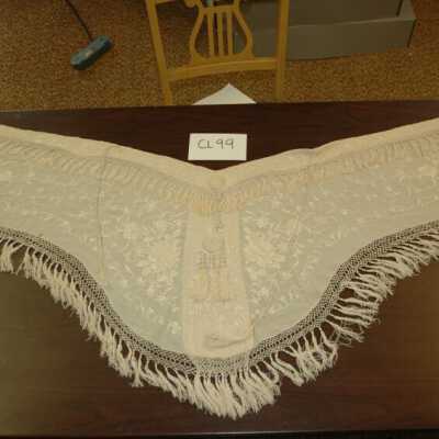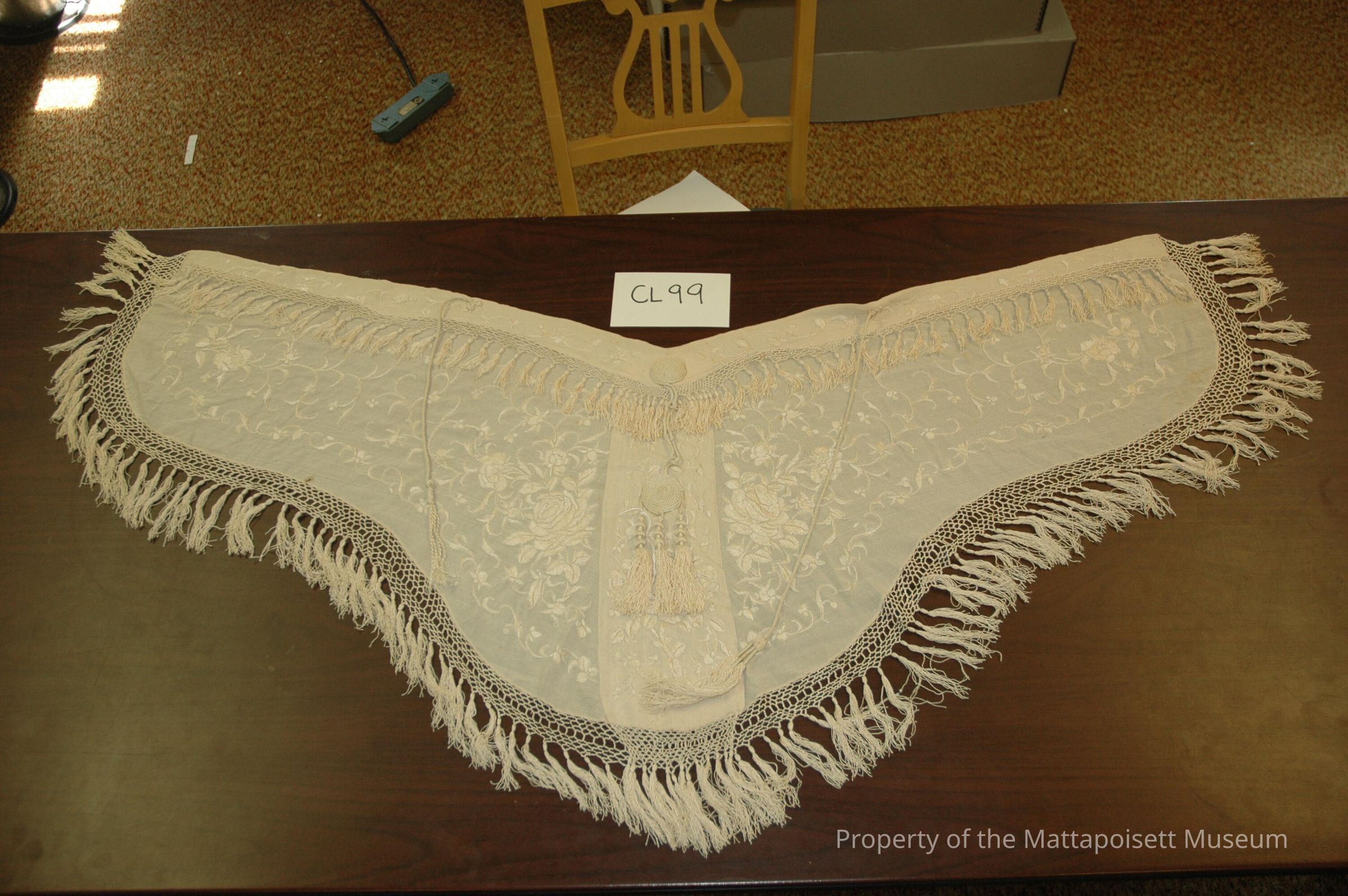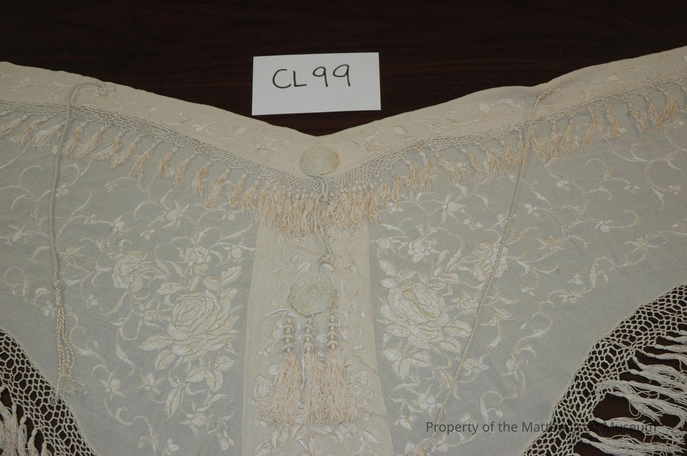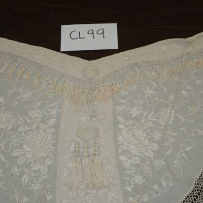 Beige silk shoulder shawl or cape. White embroidery. Tassels on back.Collection
