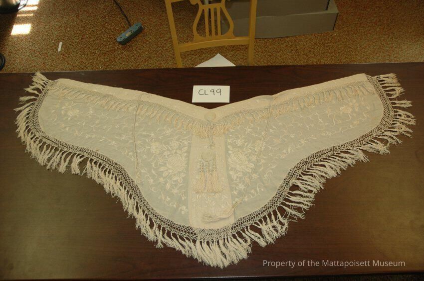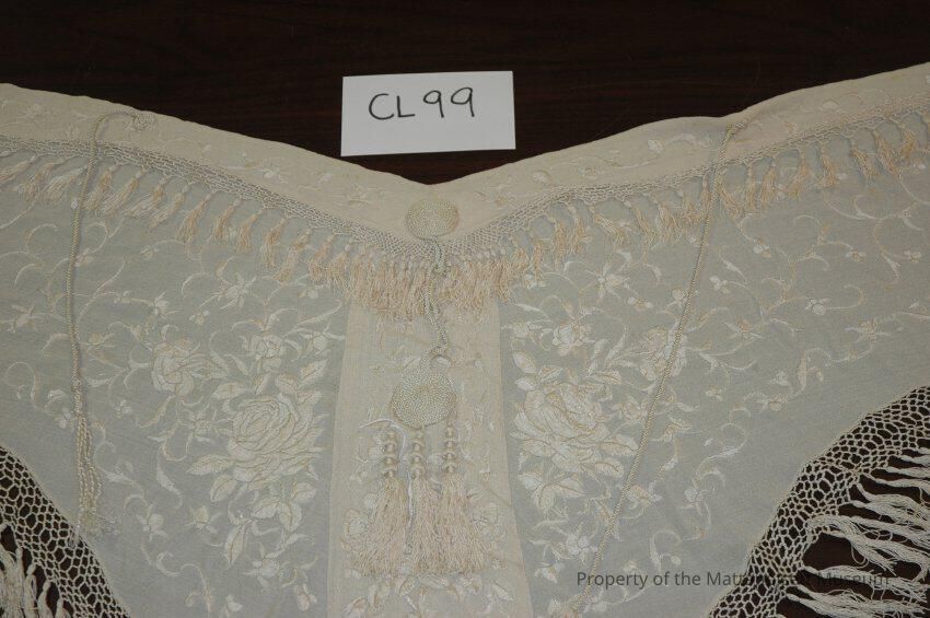 Notes: Notecard: Beige silk shoulder shawl. White embroidery.
