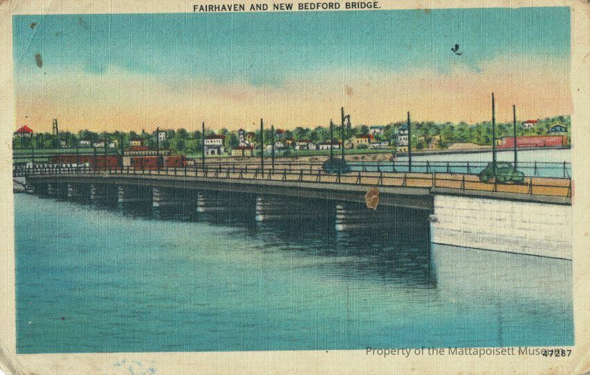 Hand-colored postcard showing Fairhaven and New Bedford Bridge.Collection