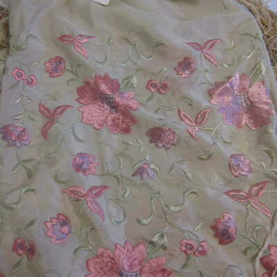 Shawl. Taupe, heavily embroidered shawl. Pink silk flowers, long fringe.Collection