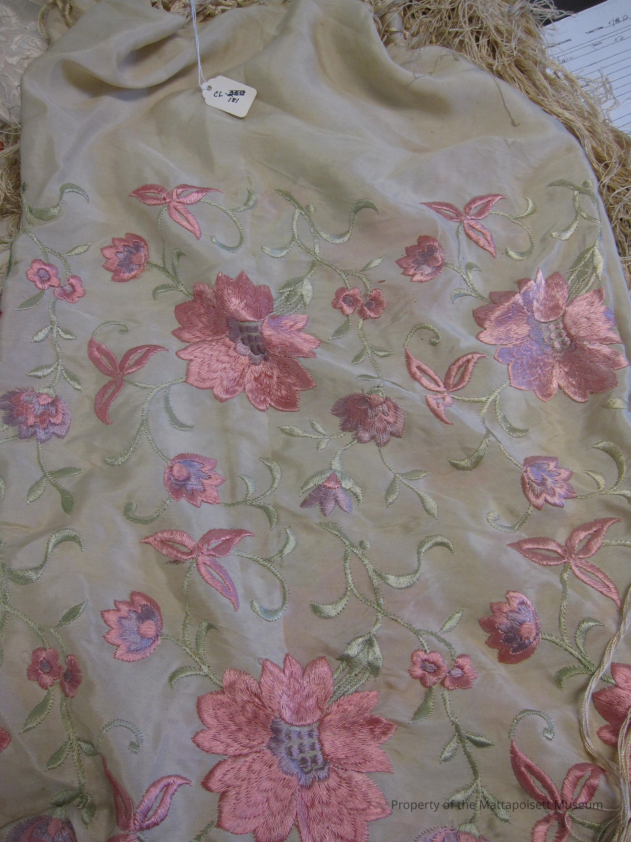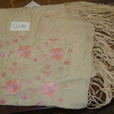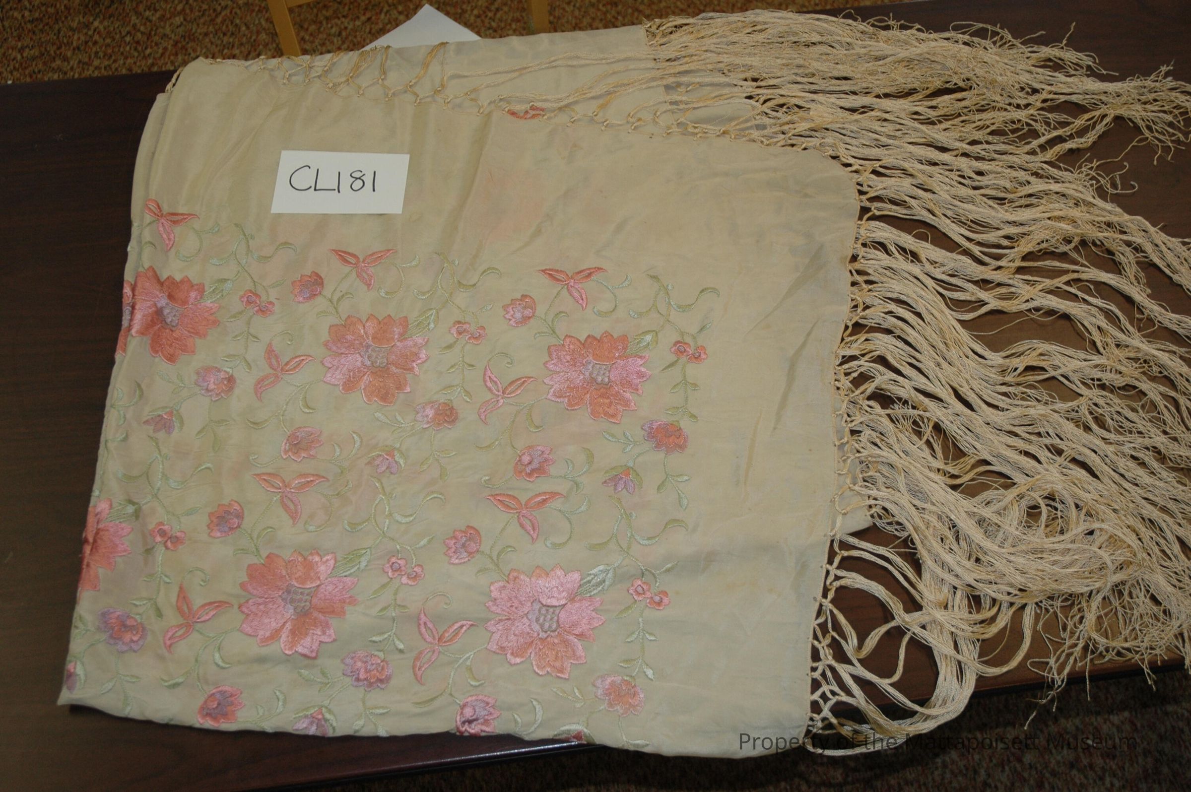 Notes: Notecard: Ivory silk shawl with pink flowers and long fringe.