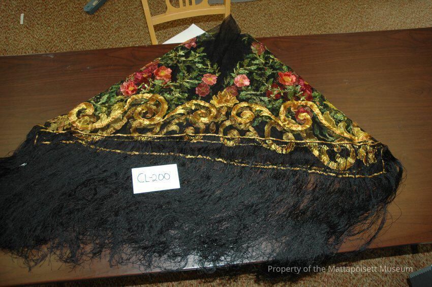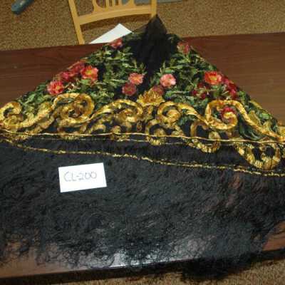 Notes: Notecard: Shawl. Black net, embroidered flowers in color, long fringe (black).