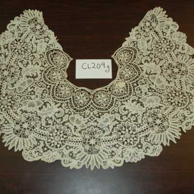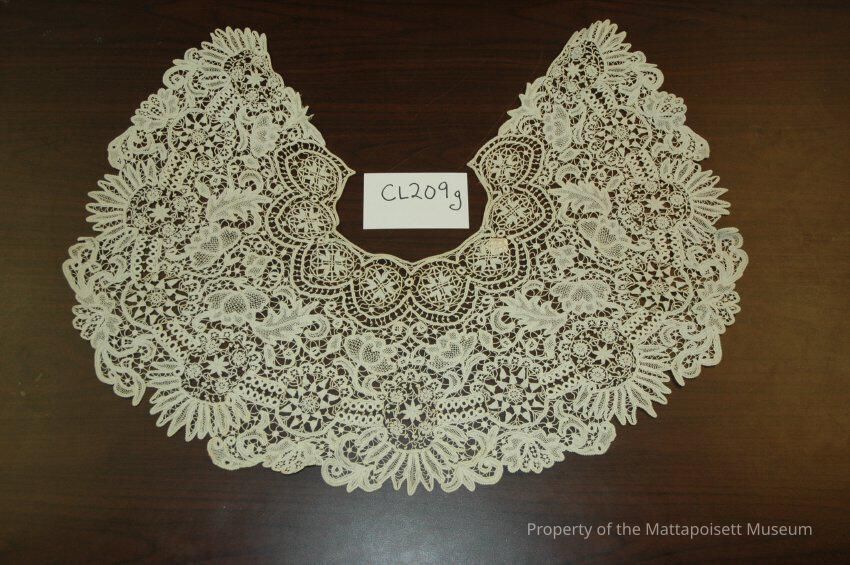Notes: Notecard: Lace capelet, ecru hand-made lace. Needle weaving, tape lace, embroidery, cut work and open work.