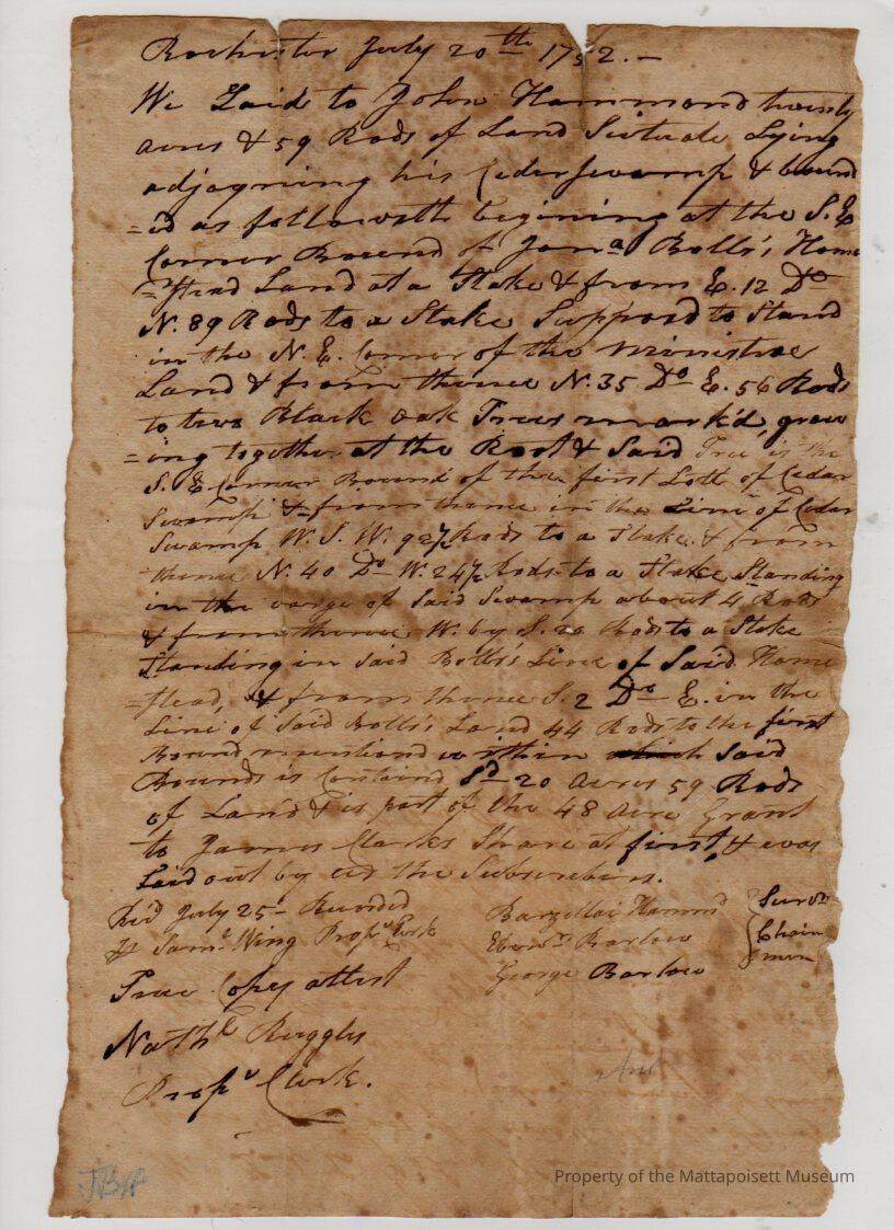 Description of 20 acres and 59 rods of land laid out to John Hammond. Copy.Collection