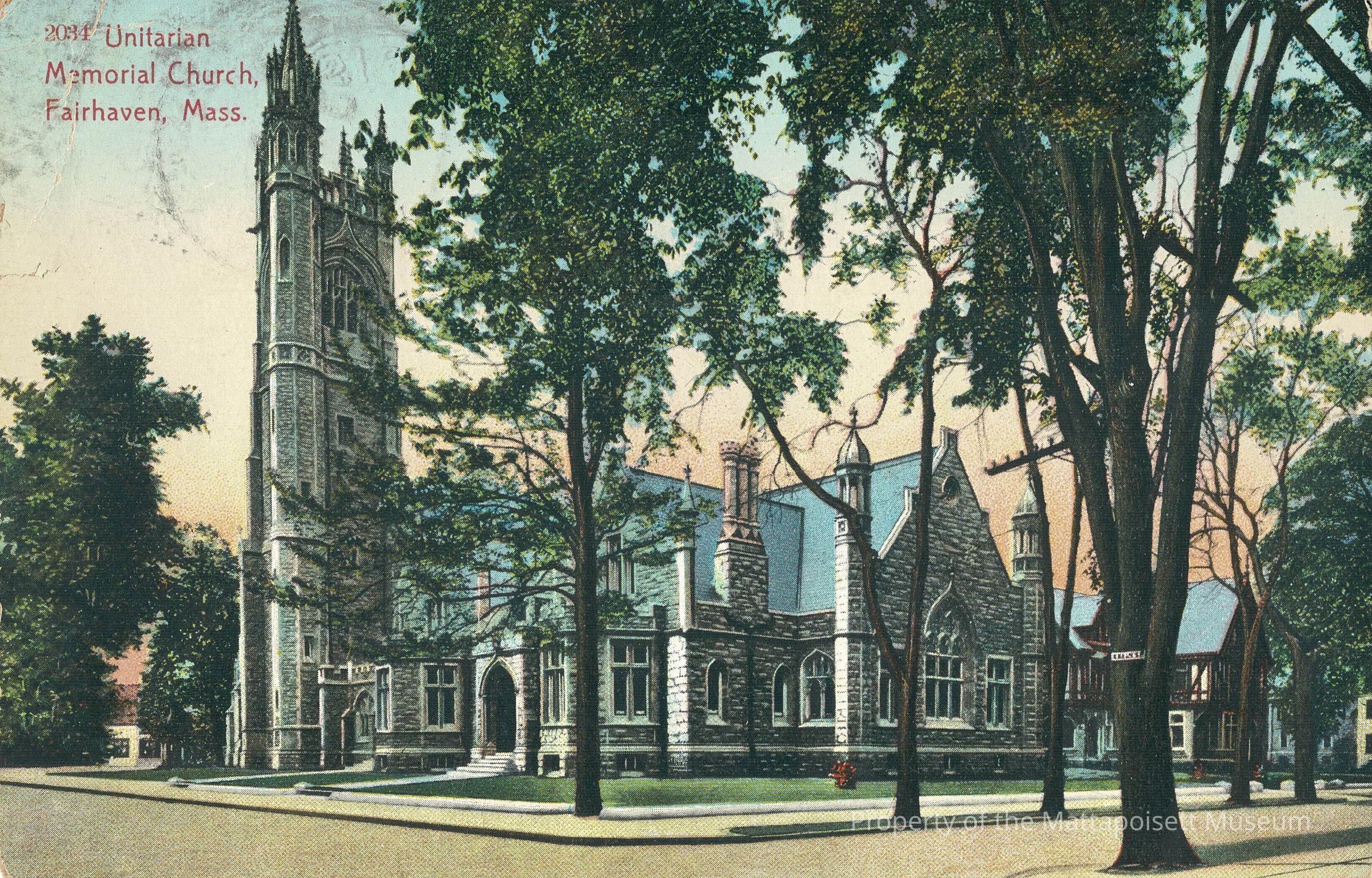 Hand-colored postcard showing Unitarian Memorial Church, Fairhaven, Mass. Handwritten address to Mr. Willia, Aiken, 586 Ashmont Street, Dorchester, Mass. Postmarked Mattapoisett, September 28 (date not legible).Collection