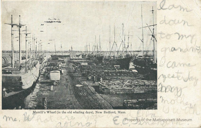 Black and white postcard showing Merrill's Wharf (in the old whaling days), New Bedford, Mass. Handwritten note in pencil from Ella, E.C. Tinkham to Miss Mildred Tinkham, Acushnet, Mass. c/o H. Dillingham R.F.D. Postmarked from Fairhaven and New Bedford, Mass. on July 18, 1906.Collection