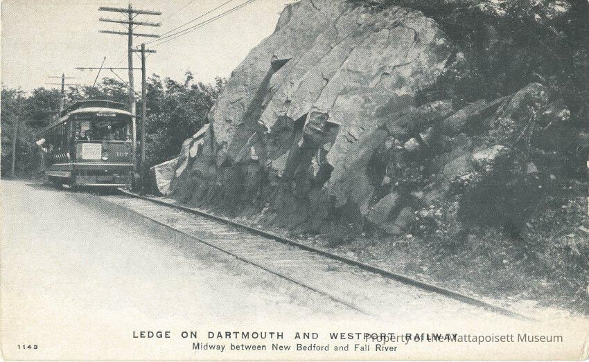 Black and white postcard showing Ledge on Dartmouth and Westport Railway, Midway between New Bedford and Fall River. Handwritten address of Ray Grindle, Campello, Mass. Care Geo E. Keith Co., Dept-6.Collection