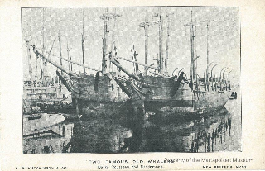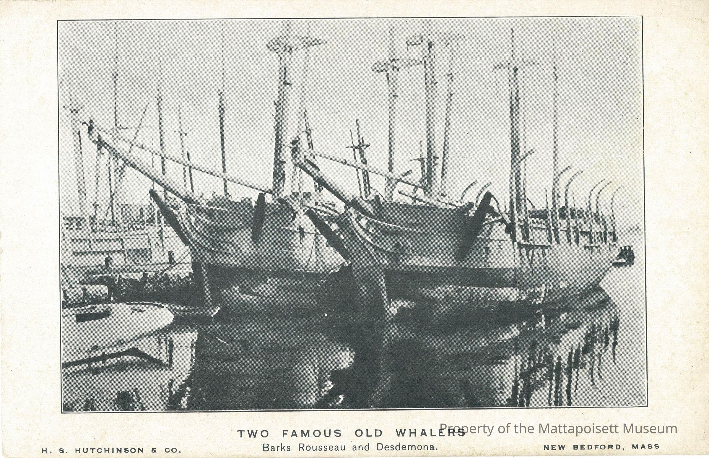 Black and white postcard showing Two Famous Old Whalers, Barks Rousseau and Desdemona, New Bedford, Mass.Collection