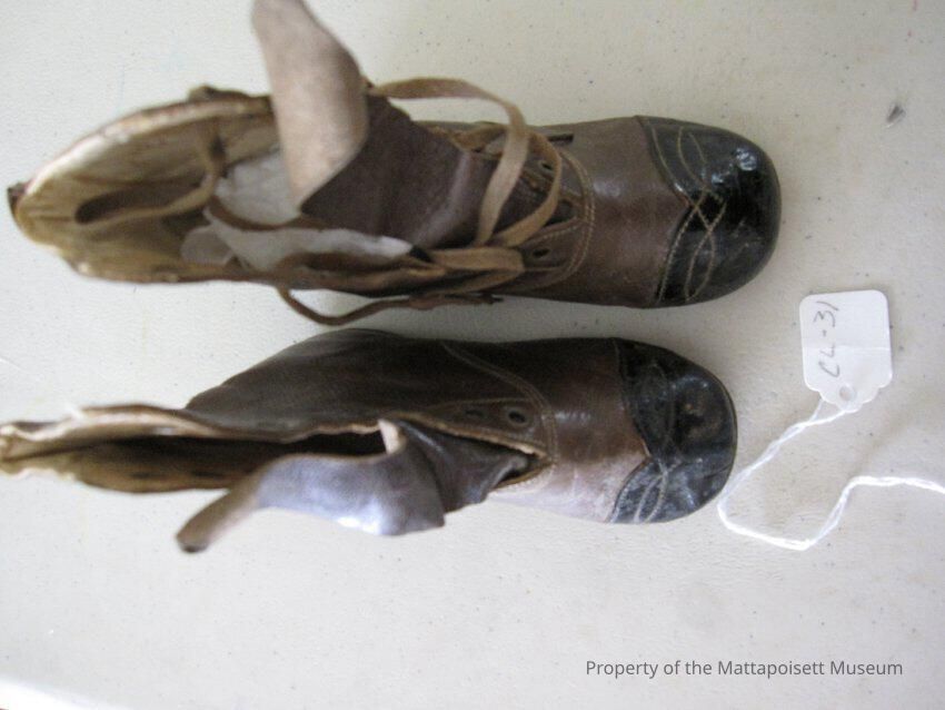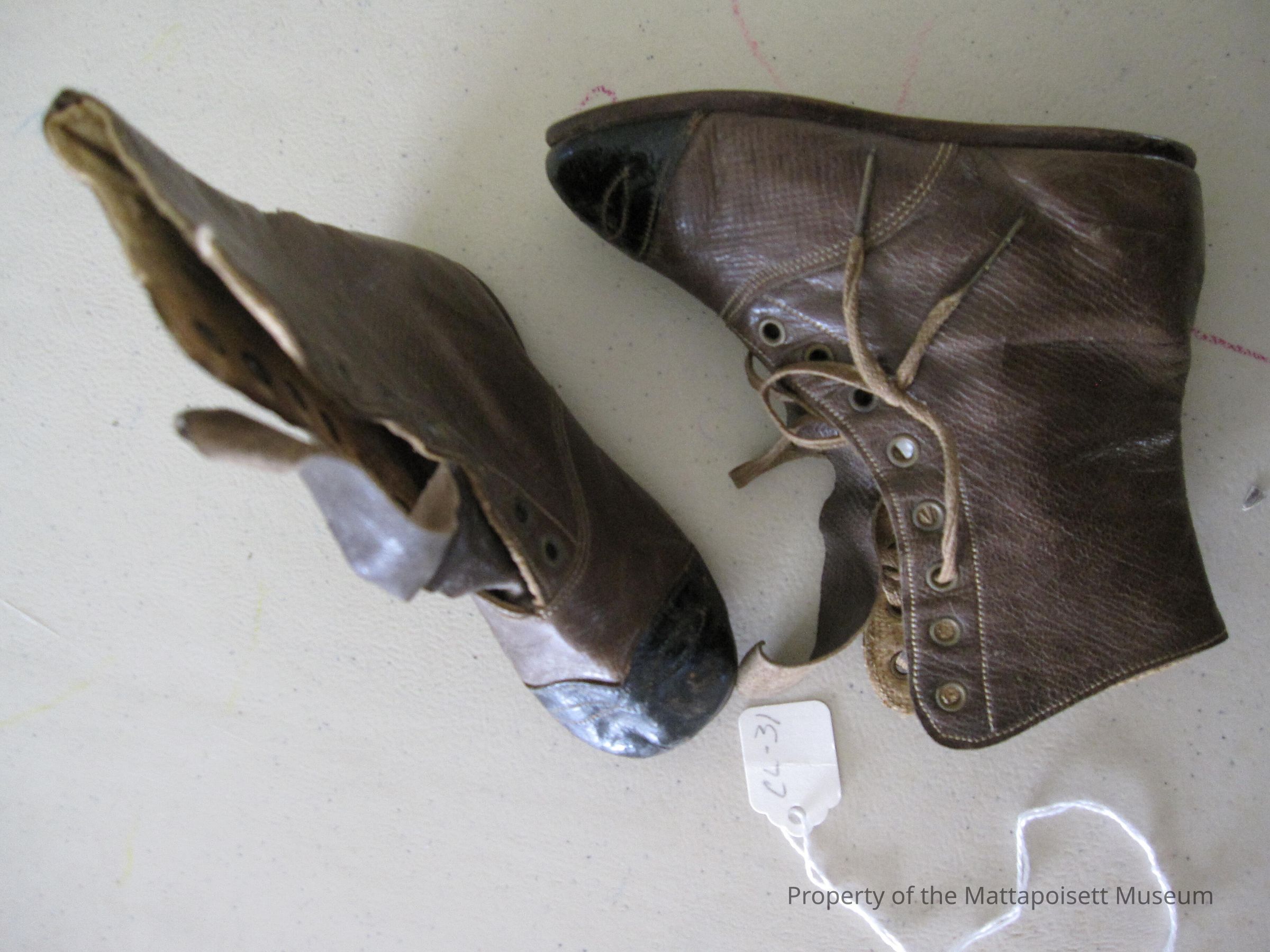 Notes: Notecard: Child's boots, laced, high. Brown leather with patent leather toes. Initials inside JPR
