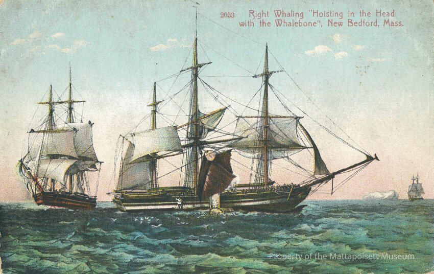 Hand-colored postcard showing Right Whaling "Hoisting in the Head with the Wahlebone", New Bedford, Mass.Collection