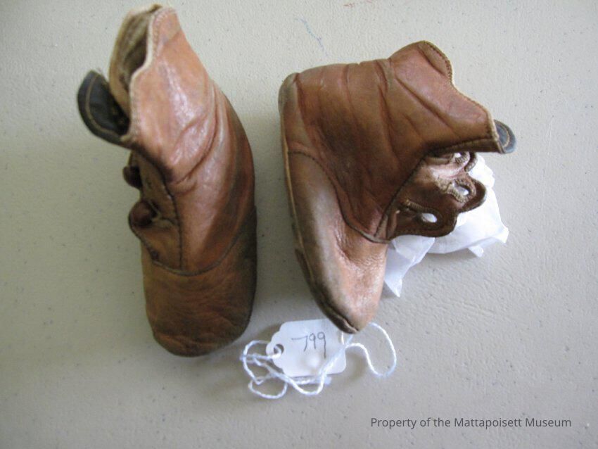 Notes: Notecard: Child's ankle-height shoes. Brown leather with side buttons.