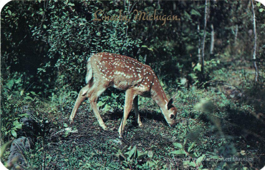 Colored postcard showing deer grazing, Lincoln, Michigan. Handwritten note to Mrs. Charles S. Mendell, Snows Pond, Rochester, Mass. Postmarked from Lincoln, Michigan, on August 2, 1956.Collection