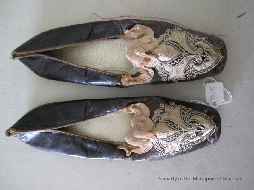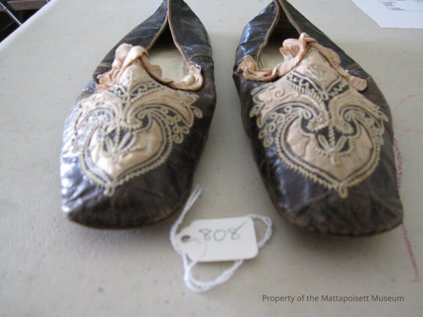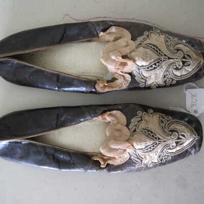 Notes: Notecard: Ladies' slippers. Black leather with beige trim, applique lace and ribbon silk detail.