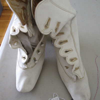 White kid calf length shoes, scalloped button closure. Cotton and silk lining. 11 buttons each side, several are missing.Collection