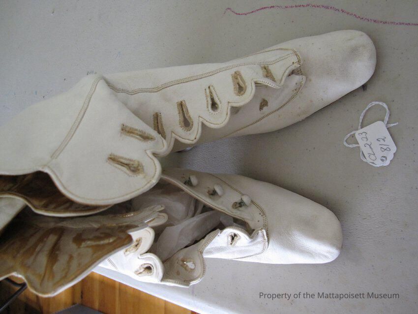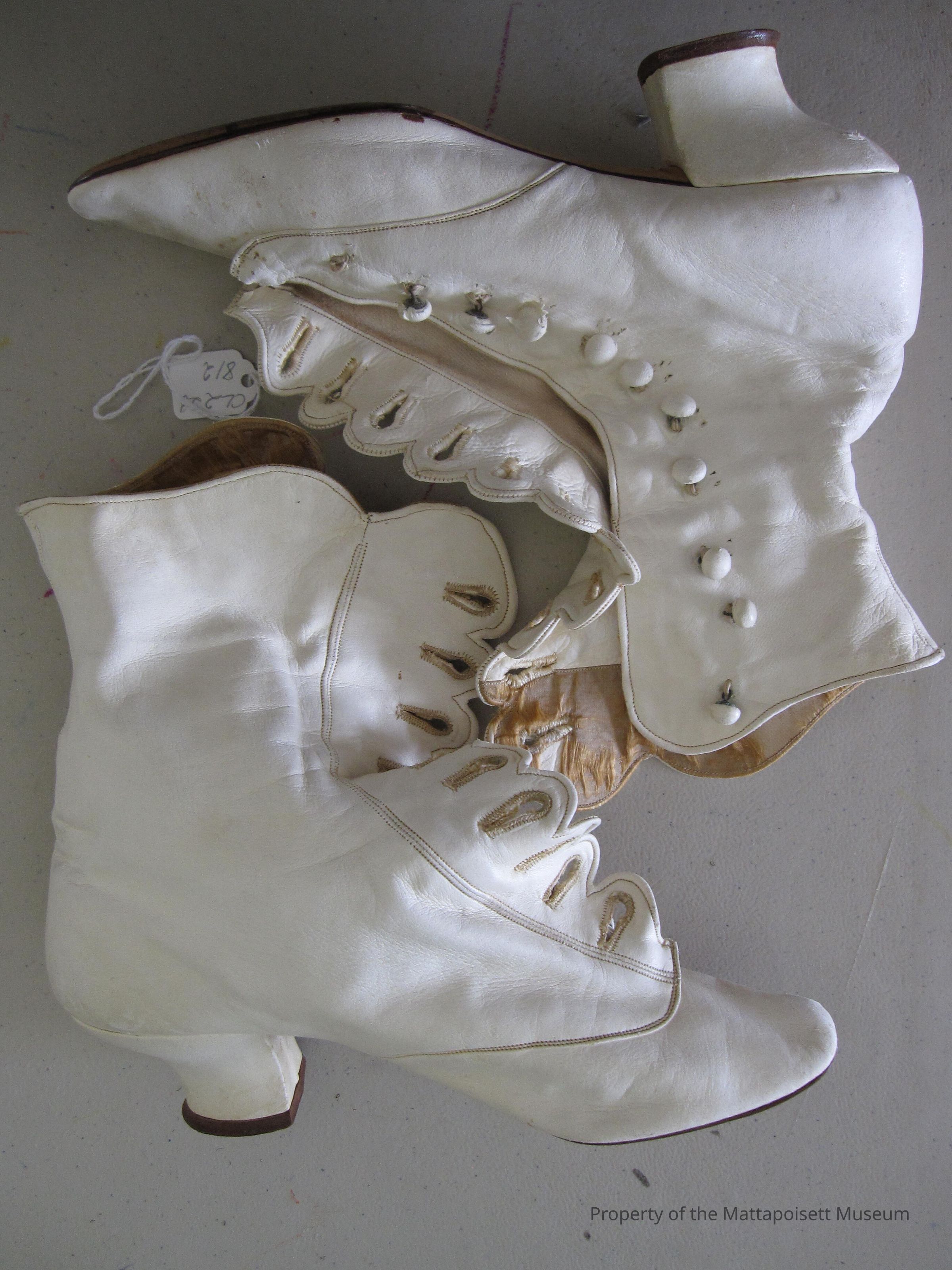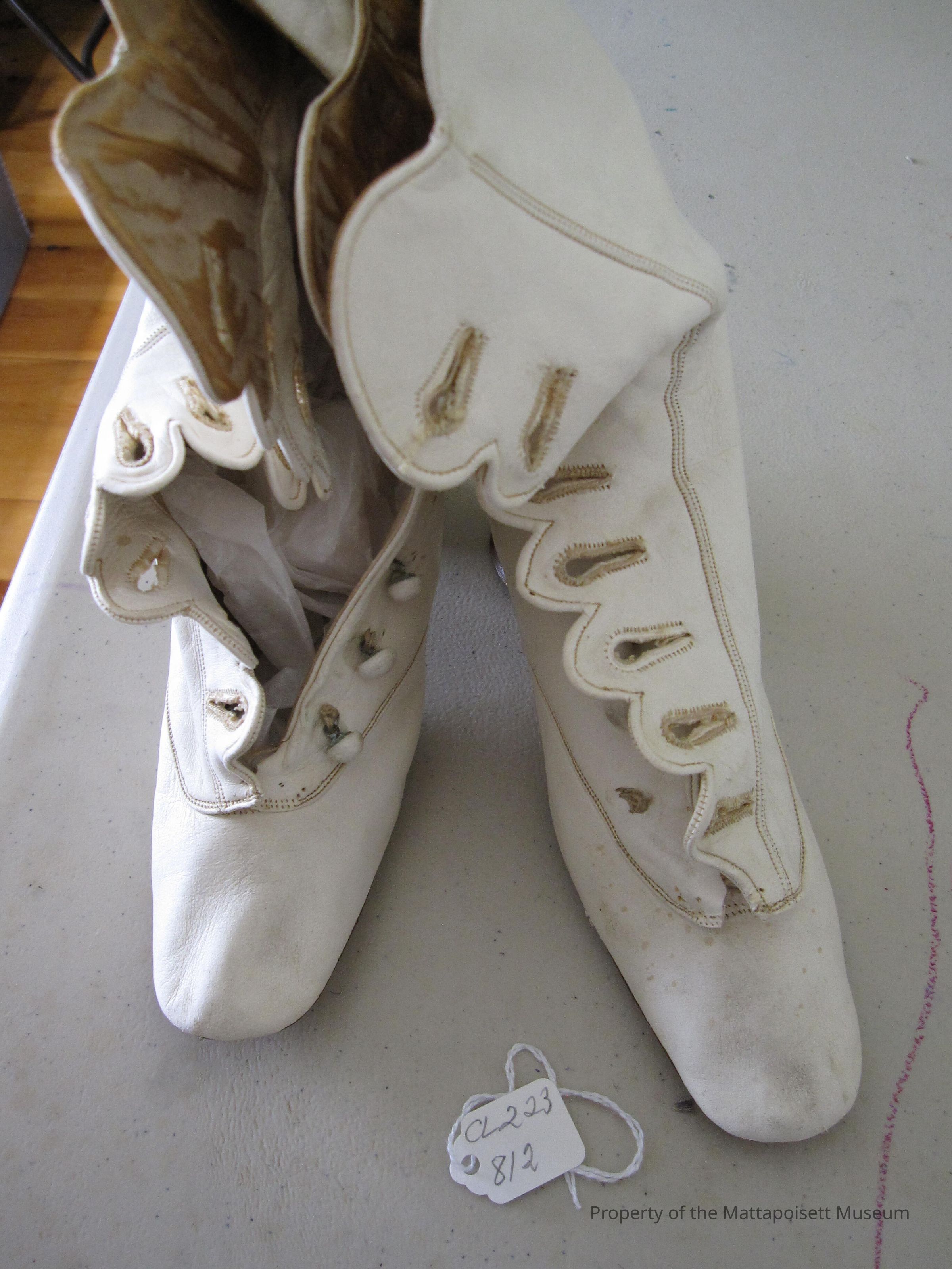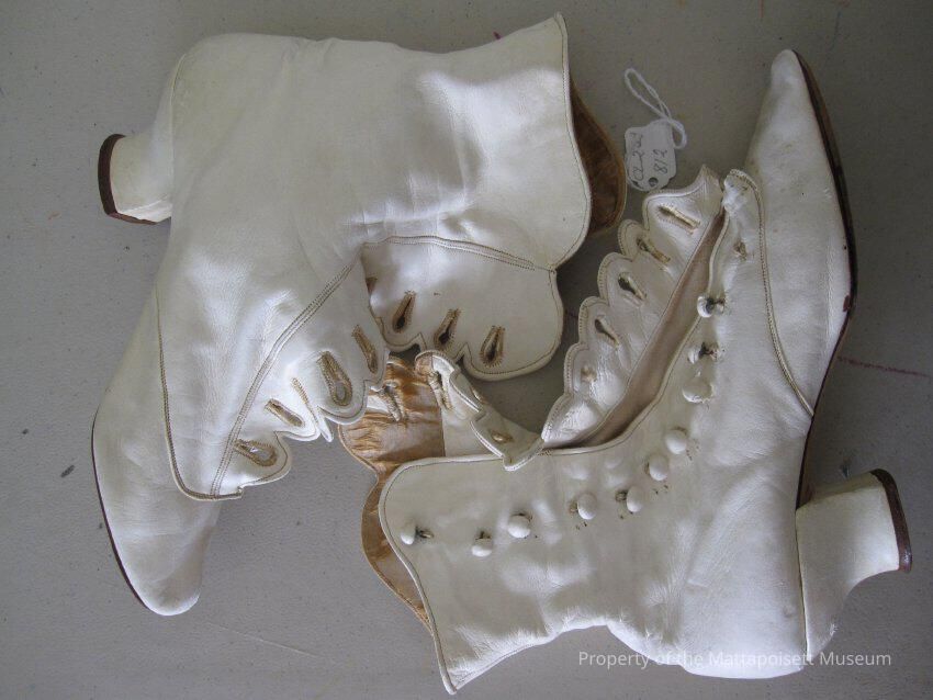 Notes: Notecard: White kid calf length shoes, scalloped bottom closure. Cotton and silk lining.