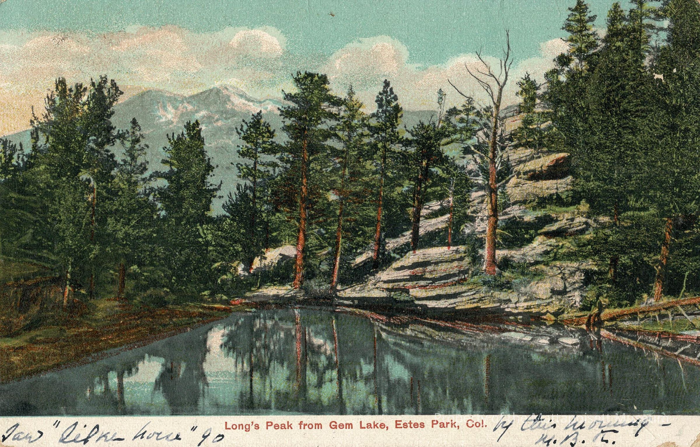 Hand-colored postcard showing Long's Peak from Gem Lake, Estes Park, Colorado. Handwritten note to Mrs. C.S. Mendell, Mattapoisett, Massachusetts. Postmarked from Loraine Park, Colorado on June 27, 1910.Collection