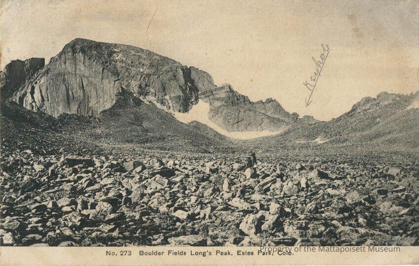 Black and white postcard showing No. 273 Boulder Fields Long's Peak, Estes Park, Colo. Handwritten note to Mrs. Charles Mendell, Mattapoisett, Mass. Postmarked from Denver, Colorado on August 30, 1911.Collection
