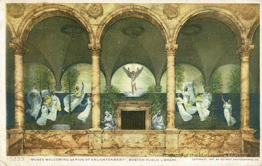 Hand-colored postcard showing Muses Welcoming Genius of Englightenment, Boston Public Library. Handwritten note to Mrs. A.F. Purrington, Mattapoisett, Massachusetts. Postmarked Boulevard, Massachusetts on January 4, 1910.Collection