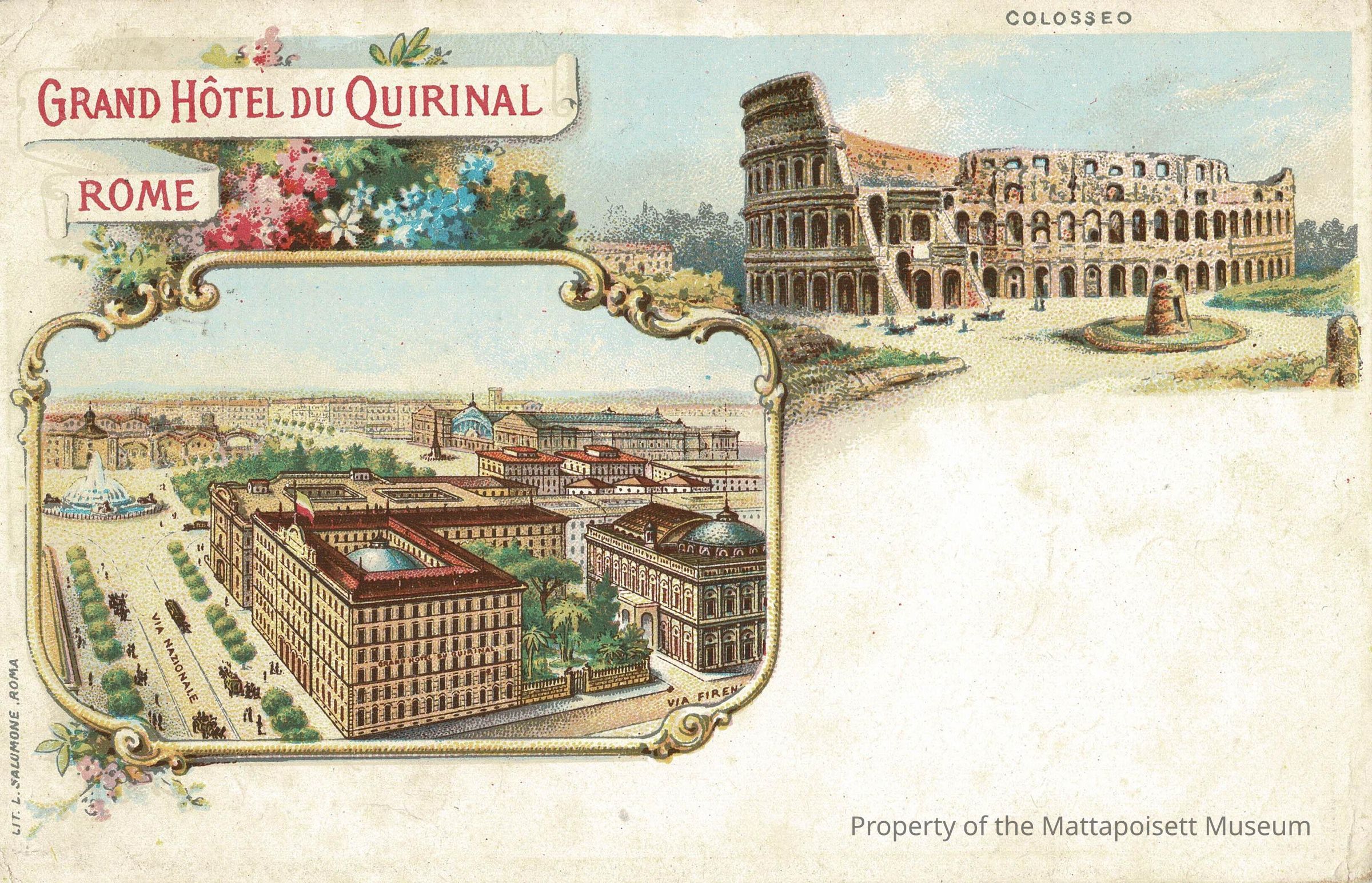 Hand-colored postcard showing Grand Hotel DuQuirinal, Rome. Handwritten note to Mrs. Purrington, Mattapoisett, Massachusetts. Postmarked from Roma, Ferrovia on September 3, 1914.Collection