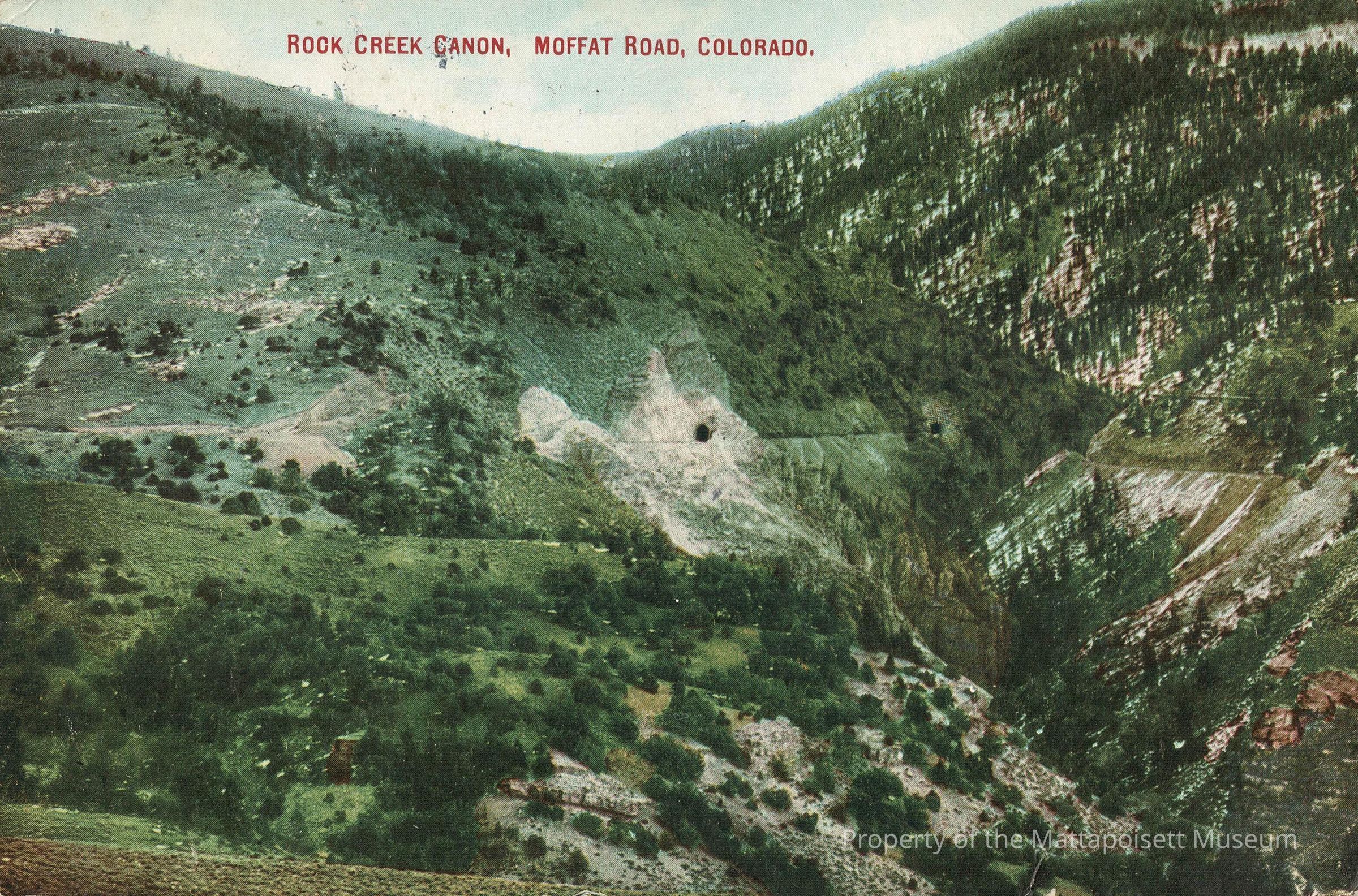 Hand-colored postcard showing Rock Creek Canon, Moffat Road, Colorado. Handwritten note to Mrs. George Purrington, Mattapoisett, Massachusetts. Postmarked from Denver, Colorado on September 2, 1915, and received and postmarked in Mattapoisett, Massachusetts on September (date not legible), 1915.Collection